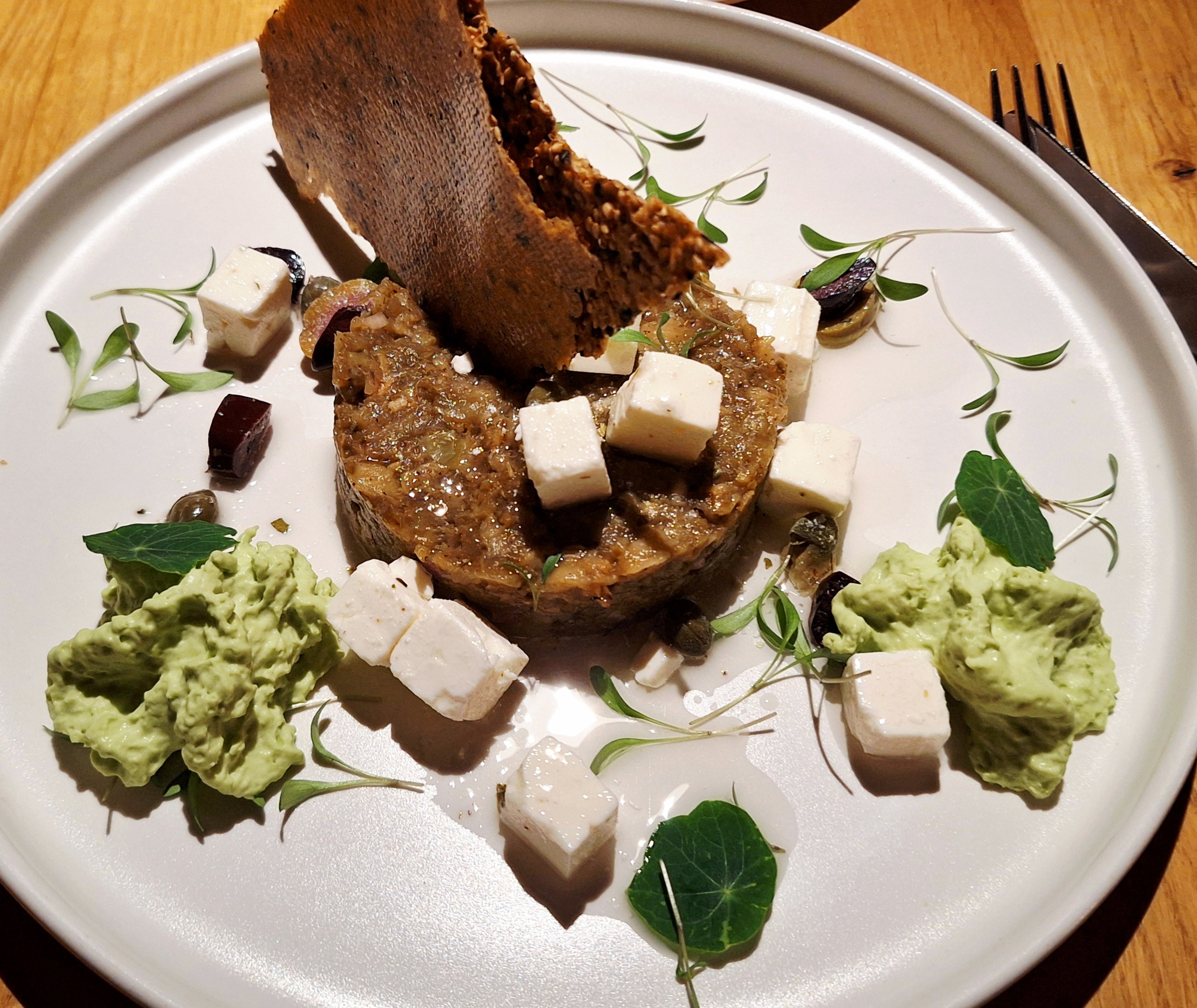 Als Vorspeise wählte ich das Auberginen-Tatar mit Fetakäse und Oliven-Espuma. Die Gewürze waren hervorragend abgestimmt, doch das Gericht wurde etwas zu kalt serviert, was den Genuss leicht trübte. Geschmacklich überzeugte es dennoch.