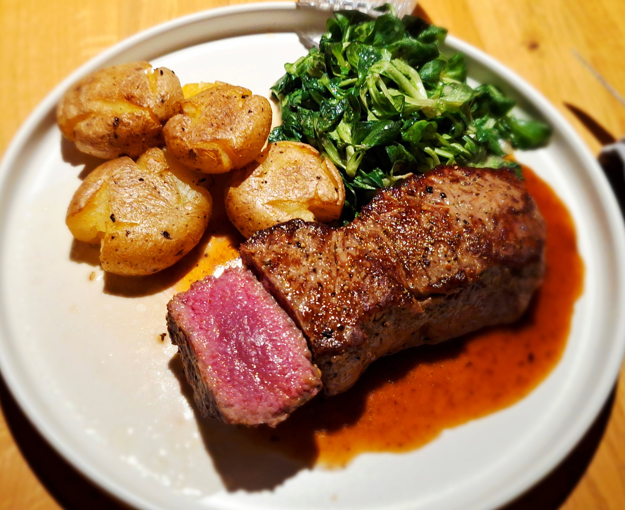 Mein Hauptgericht, ein Medium rare gebratenes Rumpsteak, traf genau meinen Wunsch: zart und saftig. Dazu gab es Smash Potatoes und geschorten Feldsalat. Während das Steak ein Genuss war, hätten die Kartoffeln etwas mehr Würze vertragen können.