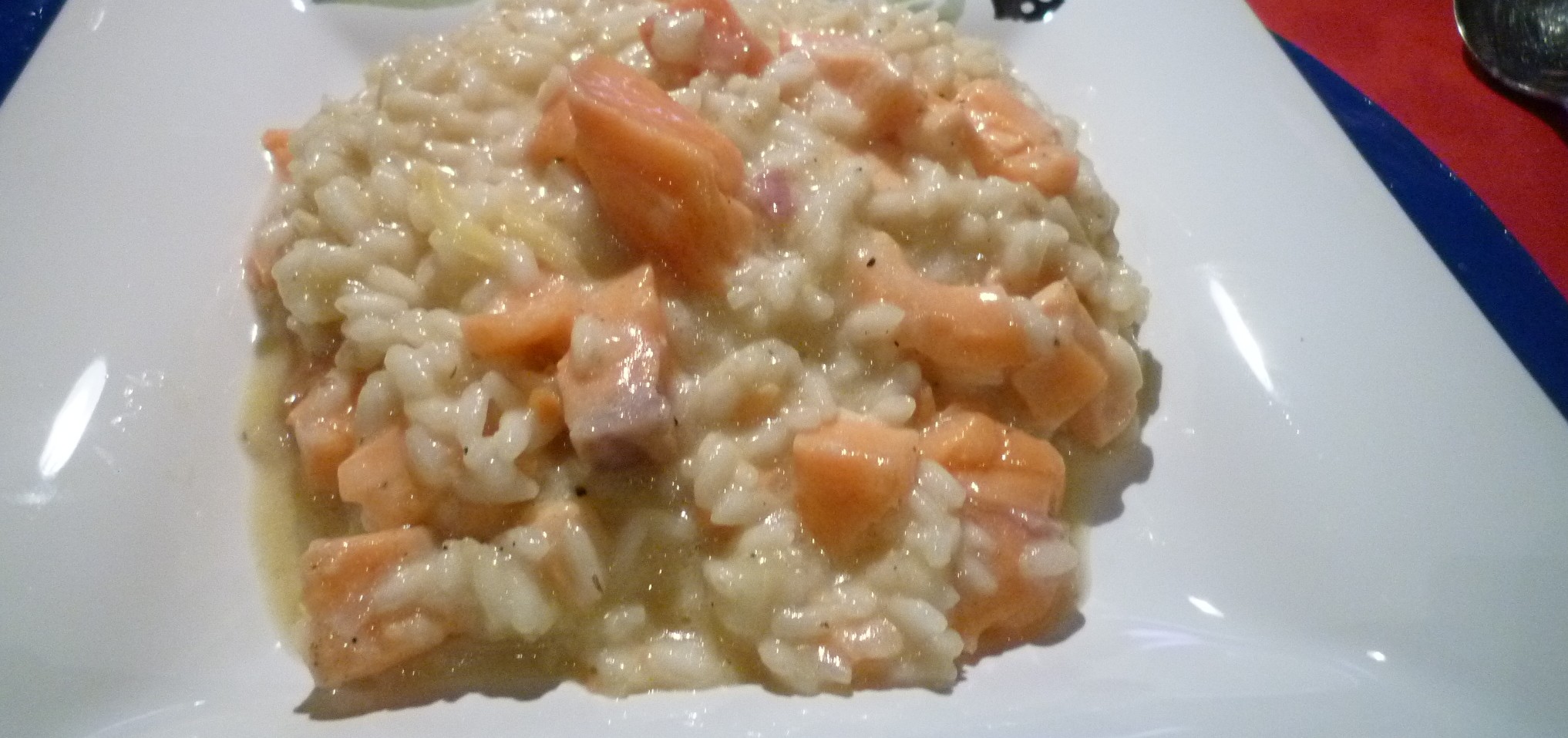 Zutaten: Risotto Reis (Carnaroli), Ingwer, Knoblauch, Olivenöl, Gemüsebrühe, Weißwein, Salzbutter, Käse. Lachs, Pfeffer.