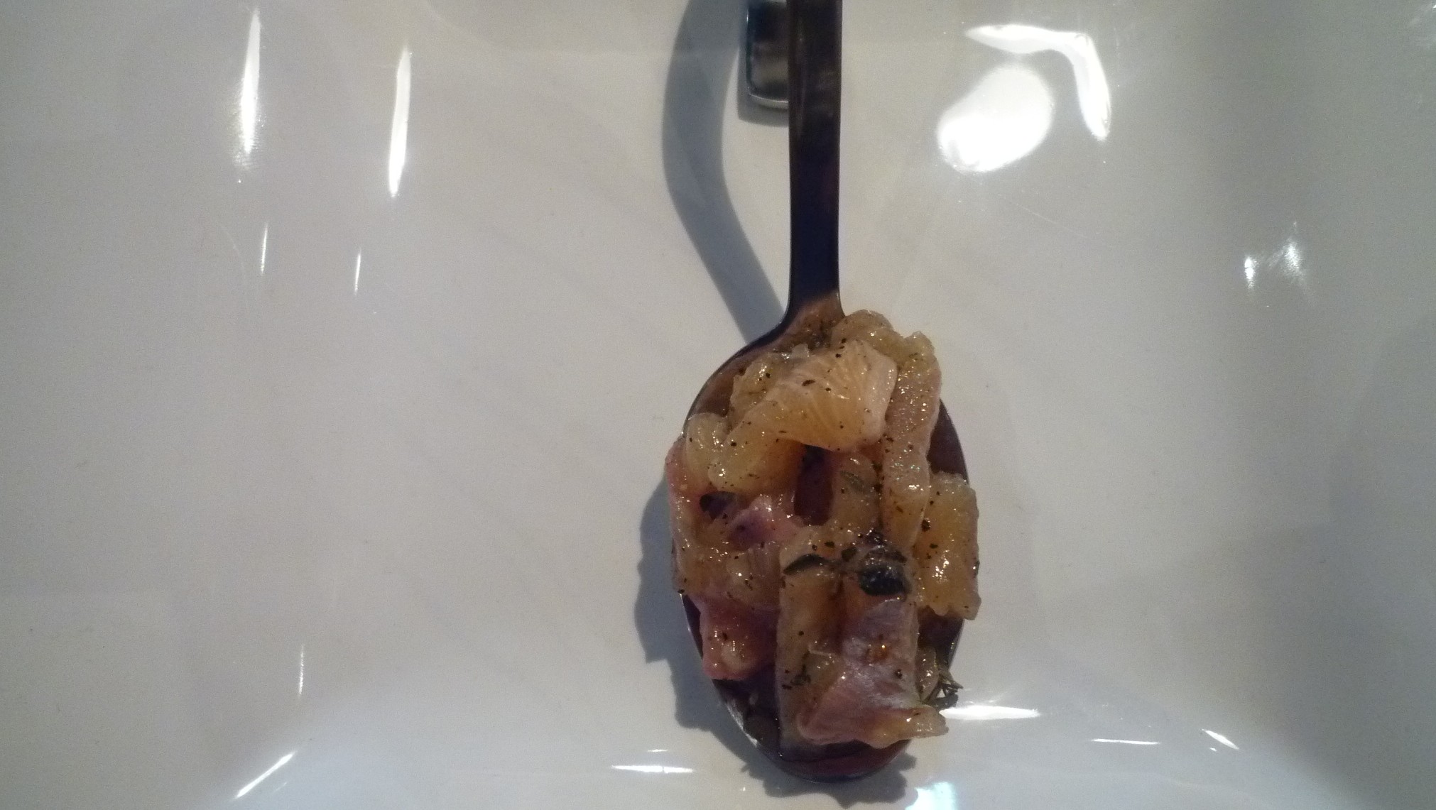 Zweimal Amuse Bouche: 1. Blätterteig mit Rochen und Gemüse, 2. Schaumsuppe von der Gänseleber und Mousse. Besonders ausdruckvoll und samtig die Schaumsuppe.