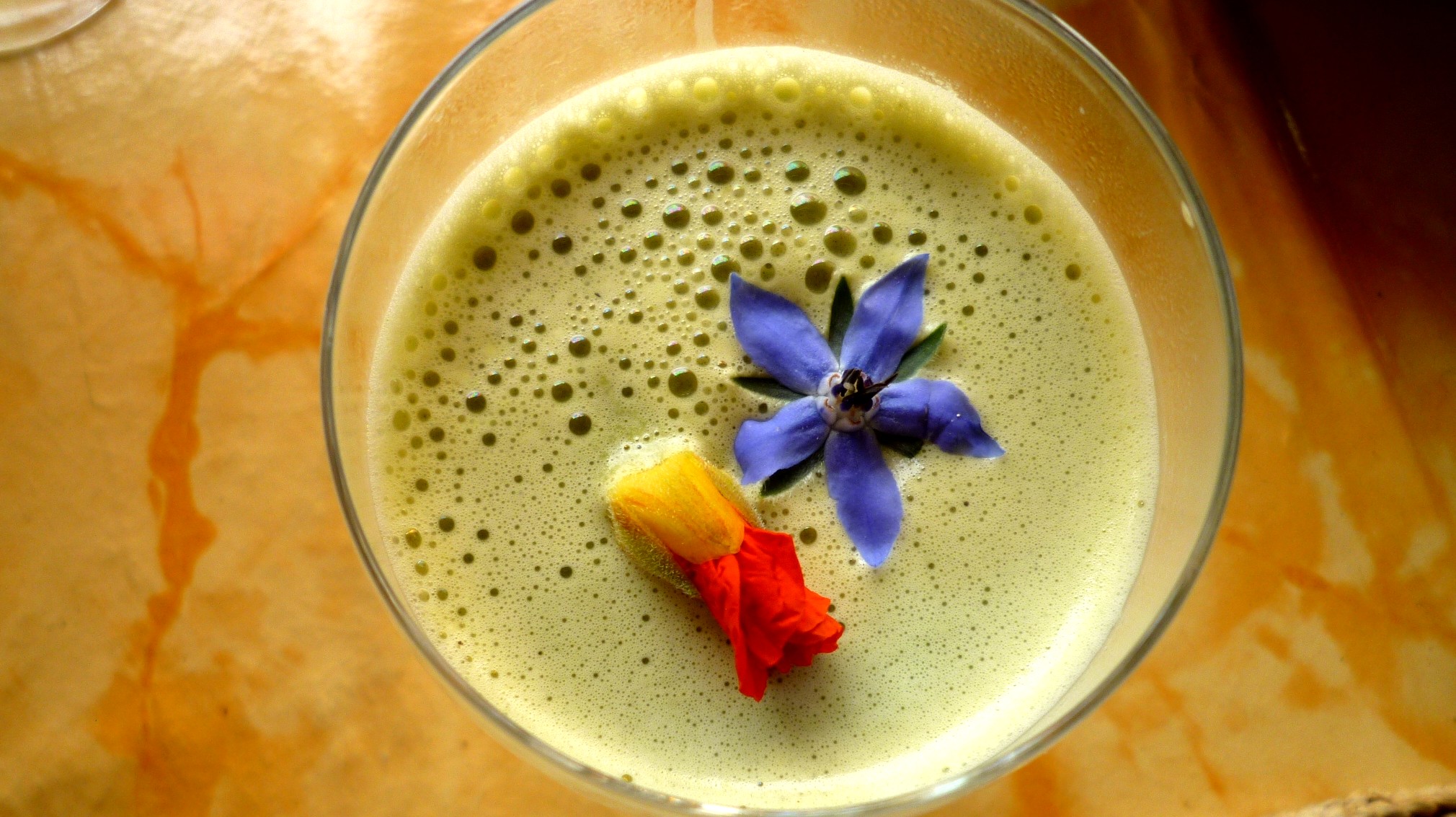 Schalen von Karotten, die Stängel vom Karottengrün und klein geschnittene geschälte Kartoffeln in Gemüsebrühe und Sahne geben und solange kochen, bis die Kartoffeln weich sind. Bis dahin noch nicht würzen. Danach alles in den Mixer geben und anschließend durch ein Sieb streichen. Das Karottengrün kurz blanchieren und in Eiswasser geben. Die Brühe wenn nötig salzen und pfeffern. Dazu kommen Knoblauch, Ingwer und Chili. Zusammen mit dem Grün mixen und durch das Sieb streichen. Vor dem servieren mit dem Stabmixer etwas Butter untermixen und im Stielglas servieren. Mit je einer Borretschblüte bzw. Kapuzinerkresse dekorieren.