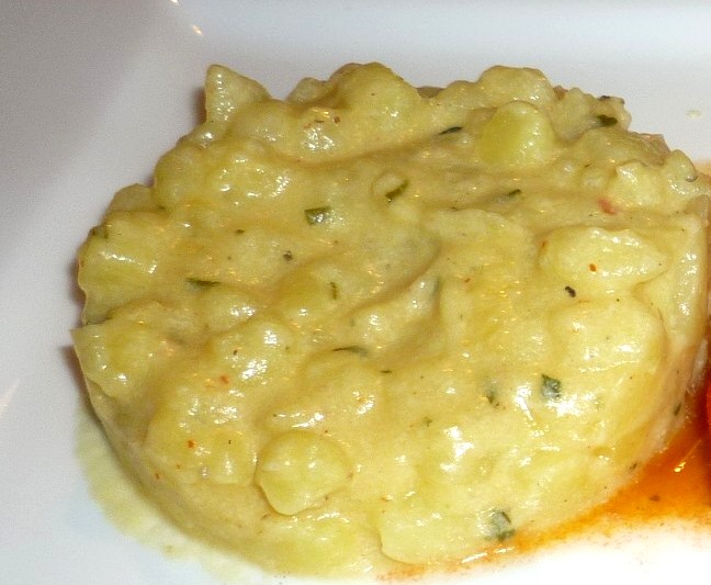 Kartoffeln schälen und in kleine Würfel schneiden. In Gemüsebrühe ca. 5 Minuten garen. Abgießen und in Olivenöl kurz anschwitzen und anschließend mit etwas Gemüsebrühe sowie Sahne aufgießen und einkochen lassen. Immer wieder umrühren. Mit Pfeffer und Muskatnuss würzen. Zum Schluss werden klein gehackter Rosmarin, Salzbutter sowie Parmesan untergehoben. Ca. 5 Minuten am Herdrand ziehen lassen.