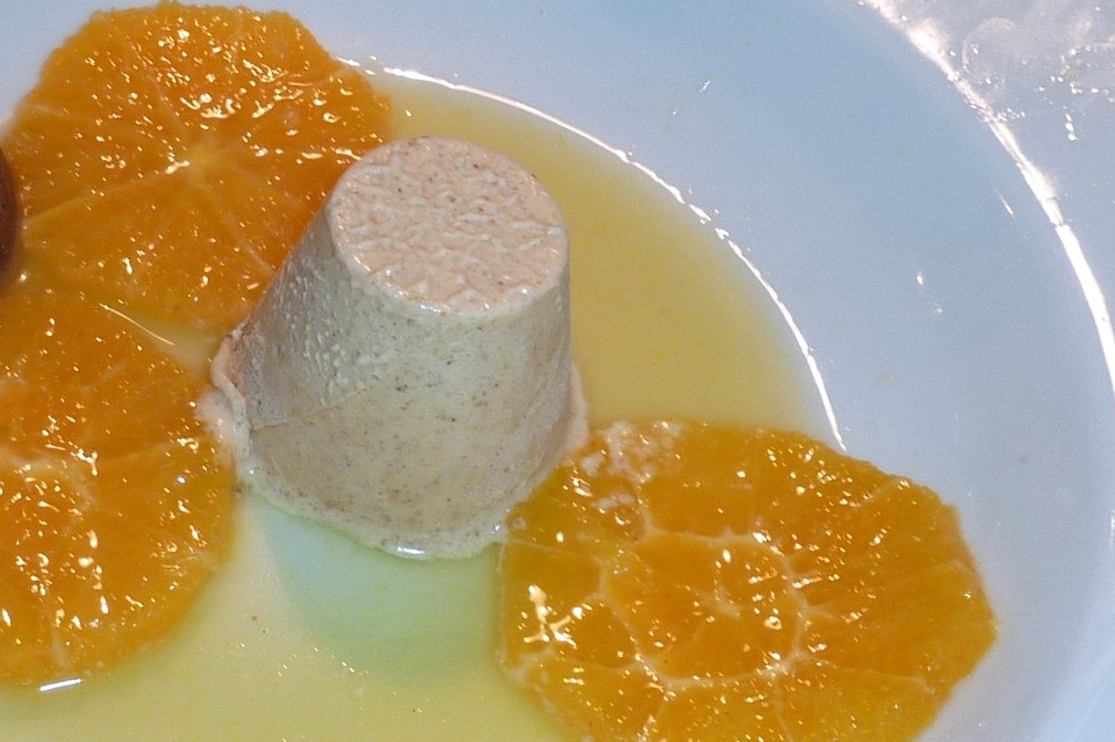 Die Formen ca. 10 Min. vor dem Servieren in den Kühlschrank stellen. Die Gewürzorangenscheiben auf einem Teller dekorativ anrichten, das Parfait dann kurz in sehr heißes Wasser halten und die Parfaits auf die Teller stürzen. Den Orangensud angießen.