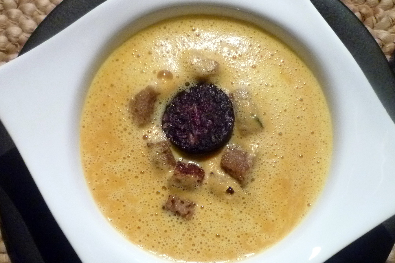 Brotwürfel vom einem Sauerteigbrot in einer Pfanne trocken anrösten und in die Suppe geben. Auf die Brotwürfel kommt eine Scheibe gebratene Blutwurst.