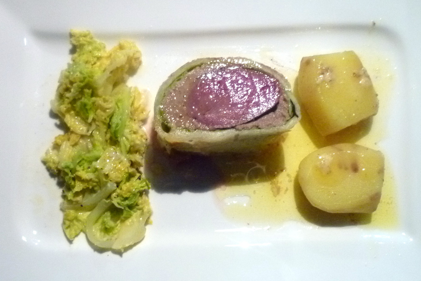 Die hellgrünen Blätter vom Wirsing lösen. Die Blätter waschen, die dicken Mittelrippen heraus schneiden und in Salzwasser blanchieren. Die Blätter zwischen Küchenpapier gut trocknen und zu einem Rechteck auslegen. Die Wirsingblätter mit der Farce bestreichen, den Rücken darauf setzen und in den Wirsingmantel einschlagen.