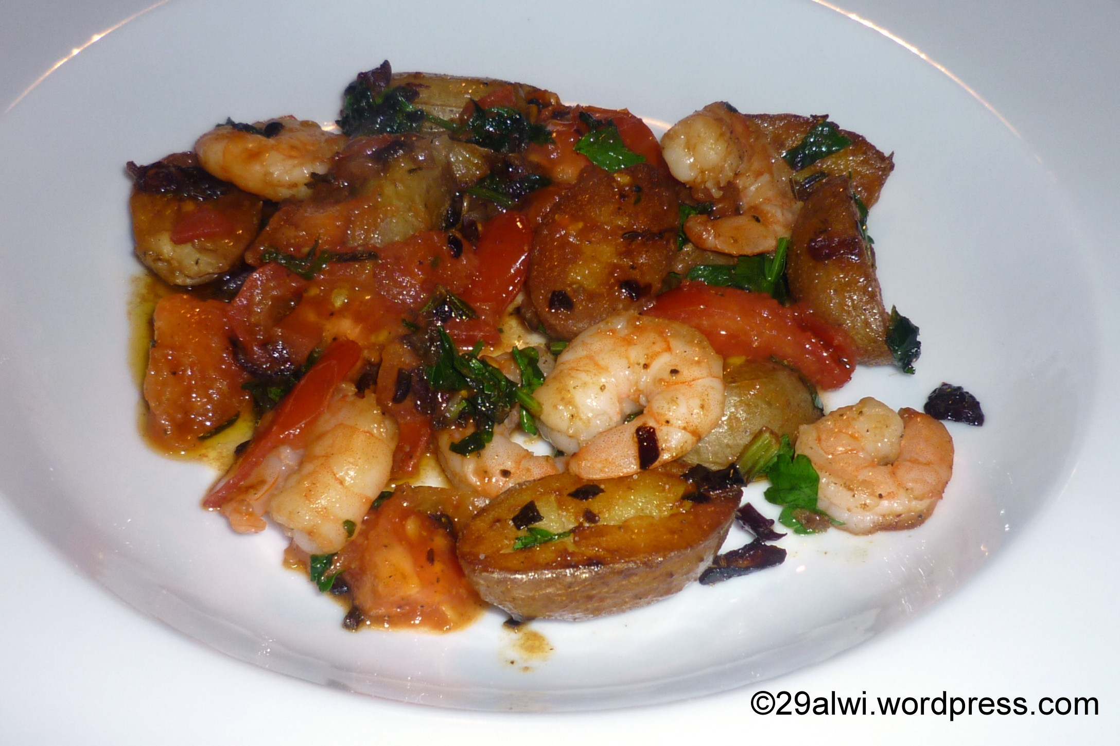 Garnelen in einer Pfanne von jeder Seite ca. 1-2 Min. braten, danach aus der Pfanne nehmen. Öl in der Pfanne erhitzen und die Kartoffeln sowie die  Zwiebeln darin rundherum goldbraun braten. Knoblauch und Ingwer dazu geben. Danach die Tomaten ca. 2 Min. mitbraten. Mit Salz und Pfeffer würzen. Die Garnelen unter die Kartoffel-Tomatenmischung heben. Petersilie in die Pfanne geben und servieren.