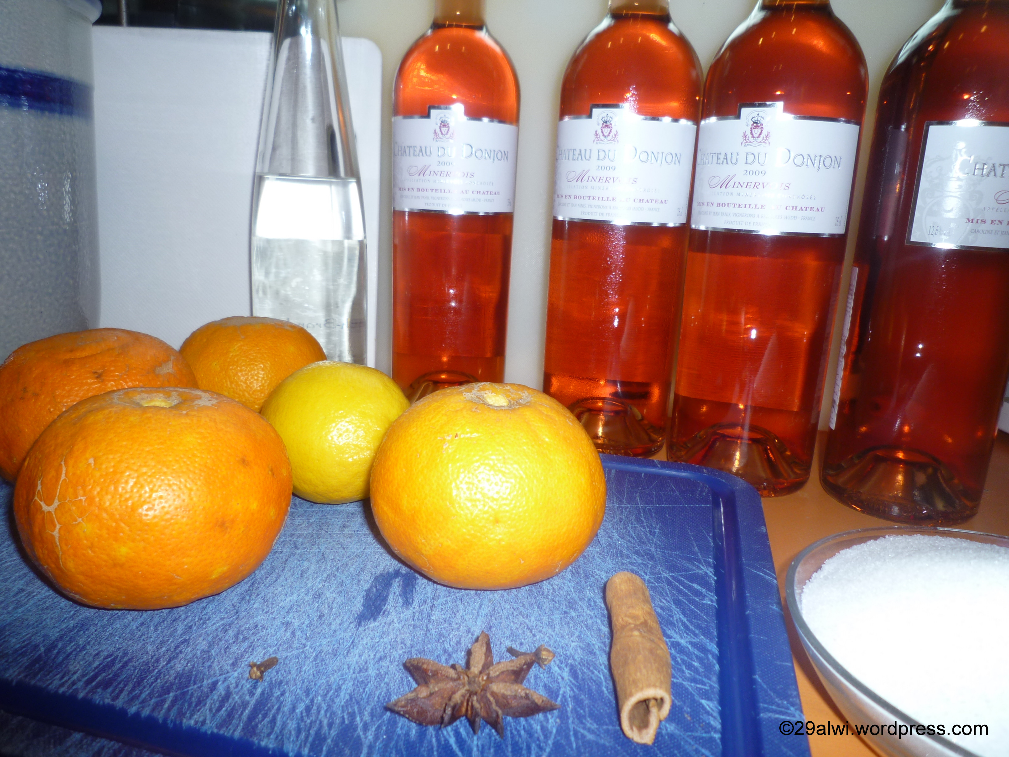 Vier Bitterorangen (Pommeranzen), eine Zitrone, 400 gr. Zucker, vier Lt. Rosewein, 200 gr. Obstbrand, zwei Zimtstangen,