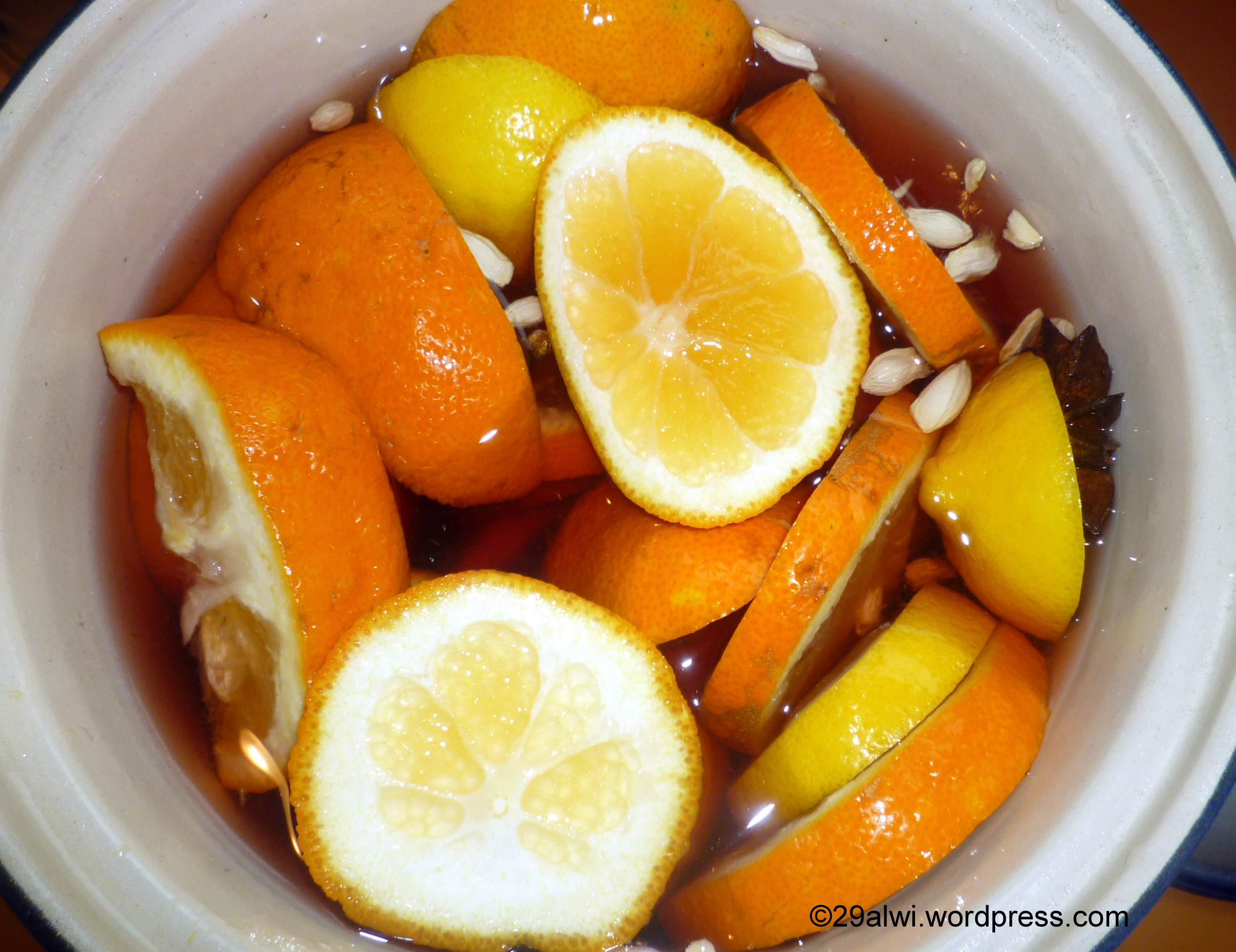 Die Bitterorangen und Zitrone einschl. Schale in Scheiben schneiden. Mit den anderen Zutaten mischen und in ein entsprechend großes Gefäß geben. Jetzt gilt es 40 Tage, also bis Ende März, abzuwarten.