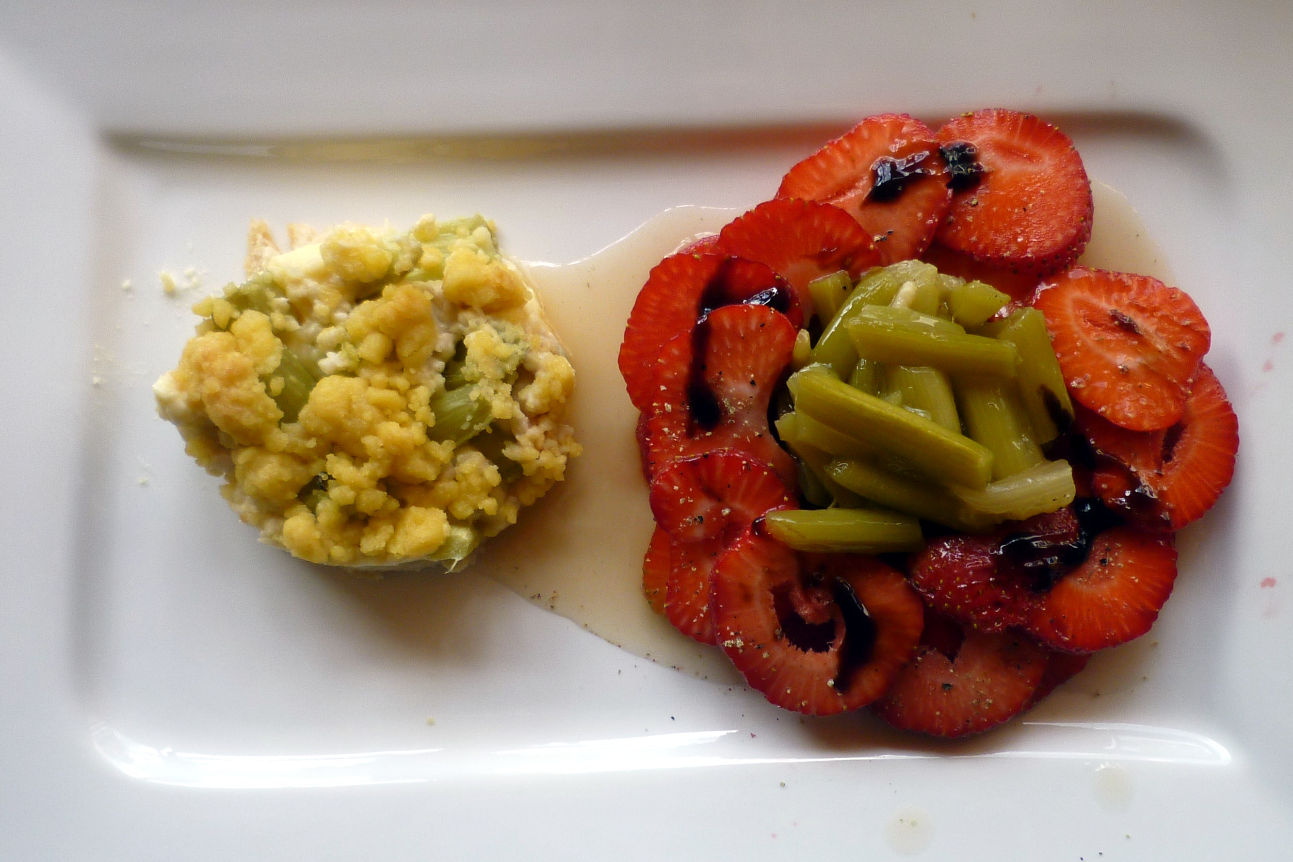Die Erdbeeren als Rosette auslegen, mittig den Rhabarber anordnen und den Sud darüber gießen. Dazu ein Stück Rhabarberkuchen mit Streuseln.