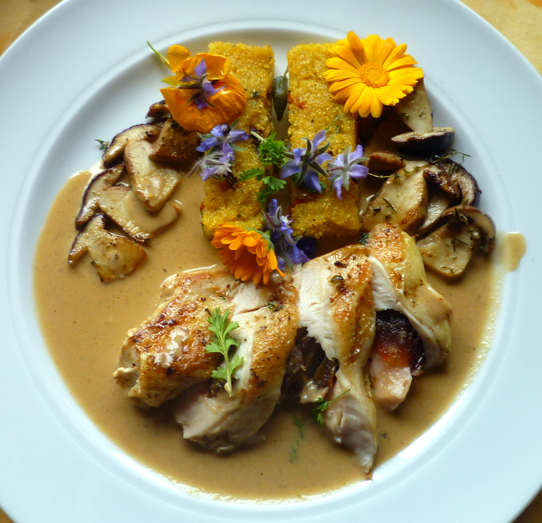 Hähnchenbrust gefüllt mit Datteln, dazu gebratene Polentaschnitten, Steinpilze und eine Steinpilz-Sahne-Sauce. Mit Blüten dekoriert.