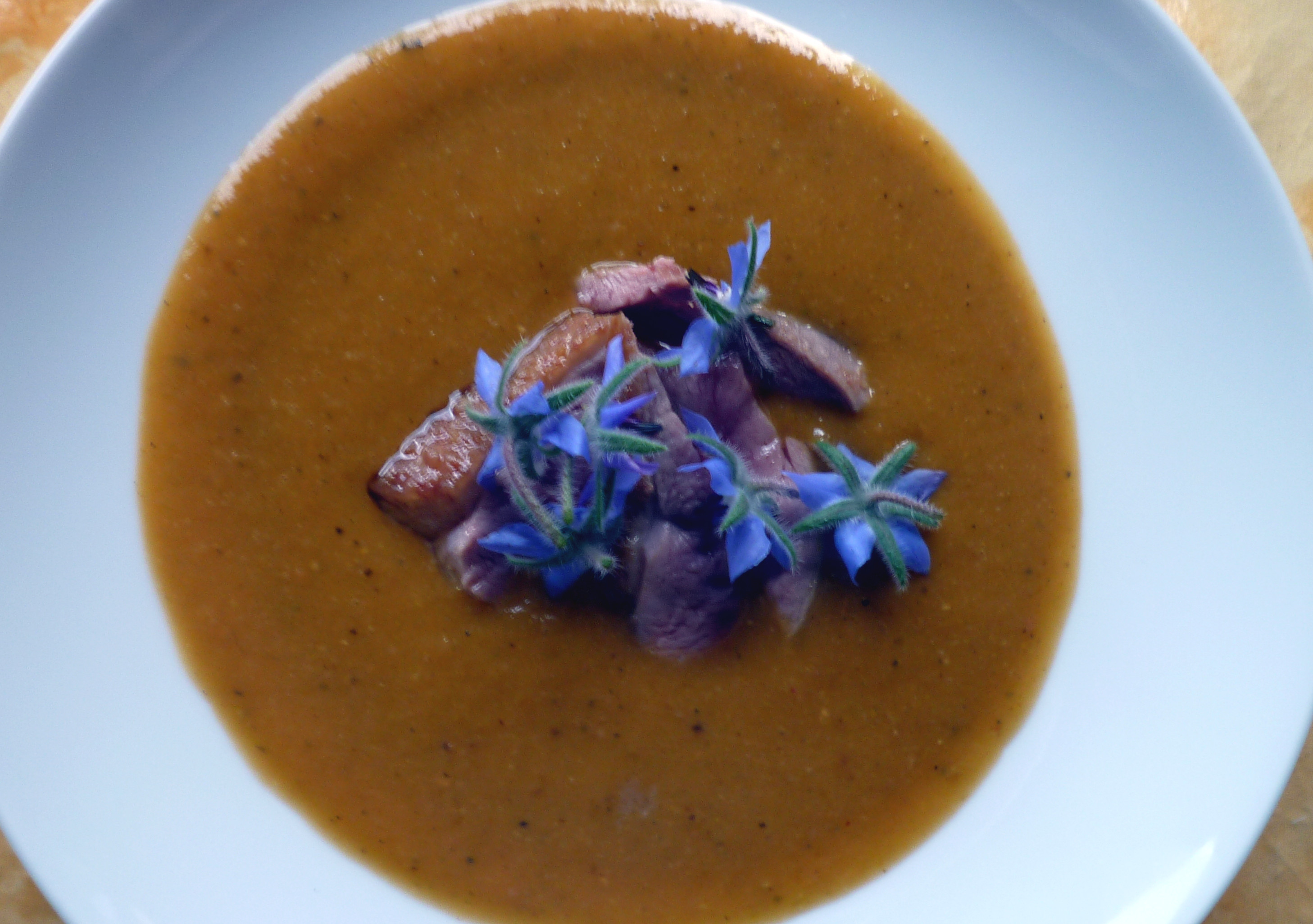 Zwetschgen putzen, entsteinen und halbieren. Braunen Zucker in einem Topf goldbraun karamellisieren. Die Zwetschgen dazugeben und mit Zwetschgenwasser ablöschen. Einige Minuten leicht kochen lassen. Weißwein, Zwetschgensaft und Wasser aufgießen und ca. 20 Minuten im offenen Topf leicht kochen lassen. Gewürzt wird mit Nelke, Zimtstange, Vanille und Ras-el-Hanout. Die Zimtstange entfernen, fein pürieren und durch ein Sieb geben. Die warme Suppe in einen tiefen Teller geben und Scheiben von einer rosa gebratenen Entenbrust in den Teller schichten. Mit Blüten dekorieren.