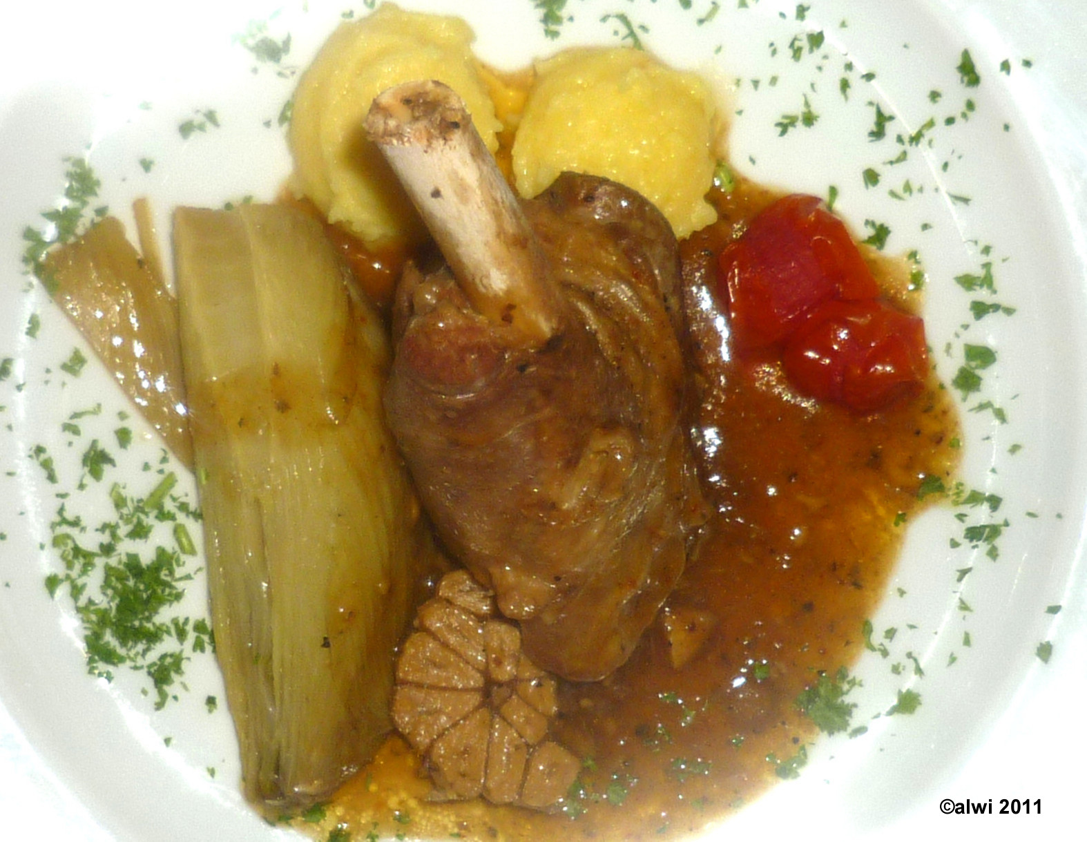 Zu den Weinen. Sommelier Markus hatte wieder eine gute Auswahl getroffen. Vom Riesling aus dem Elsass für die Tarte flambée, Silvaner vom Weingut Pawis (Saale/Unstrut) und Rotwein aus Baden für Taube und Haxe.
