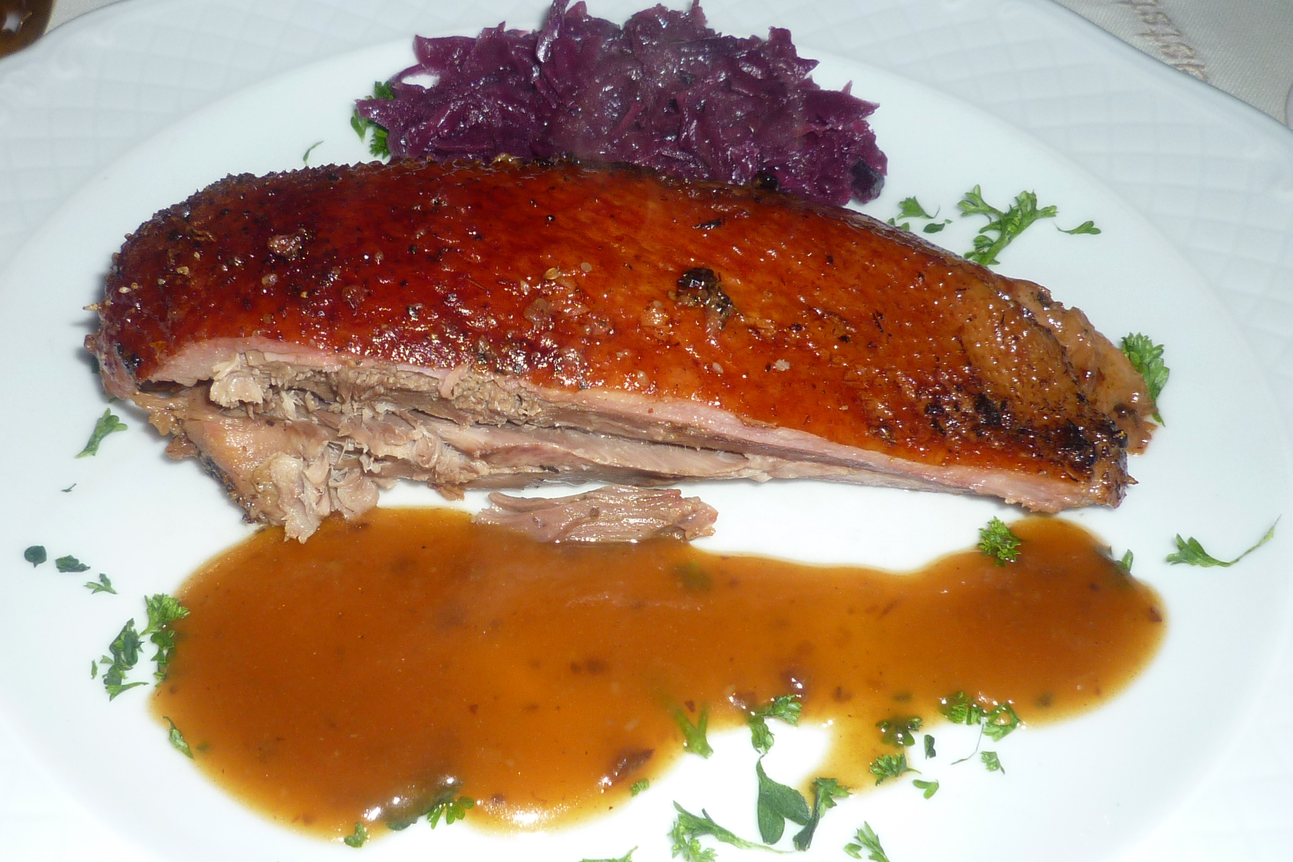 Nach einer kurzen Pause wurde dann eine halbe Gänsebrust auf neuen Tellern serviert. Auch hier das Fleisch in Ordnung, aber leider fehlte auch hier die krosse Haut.