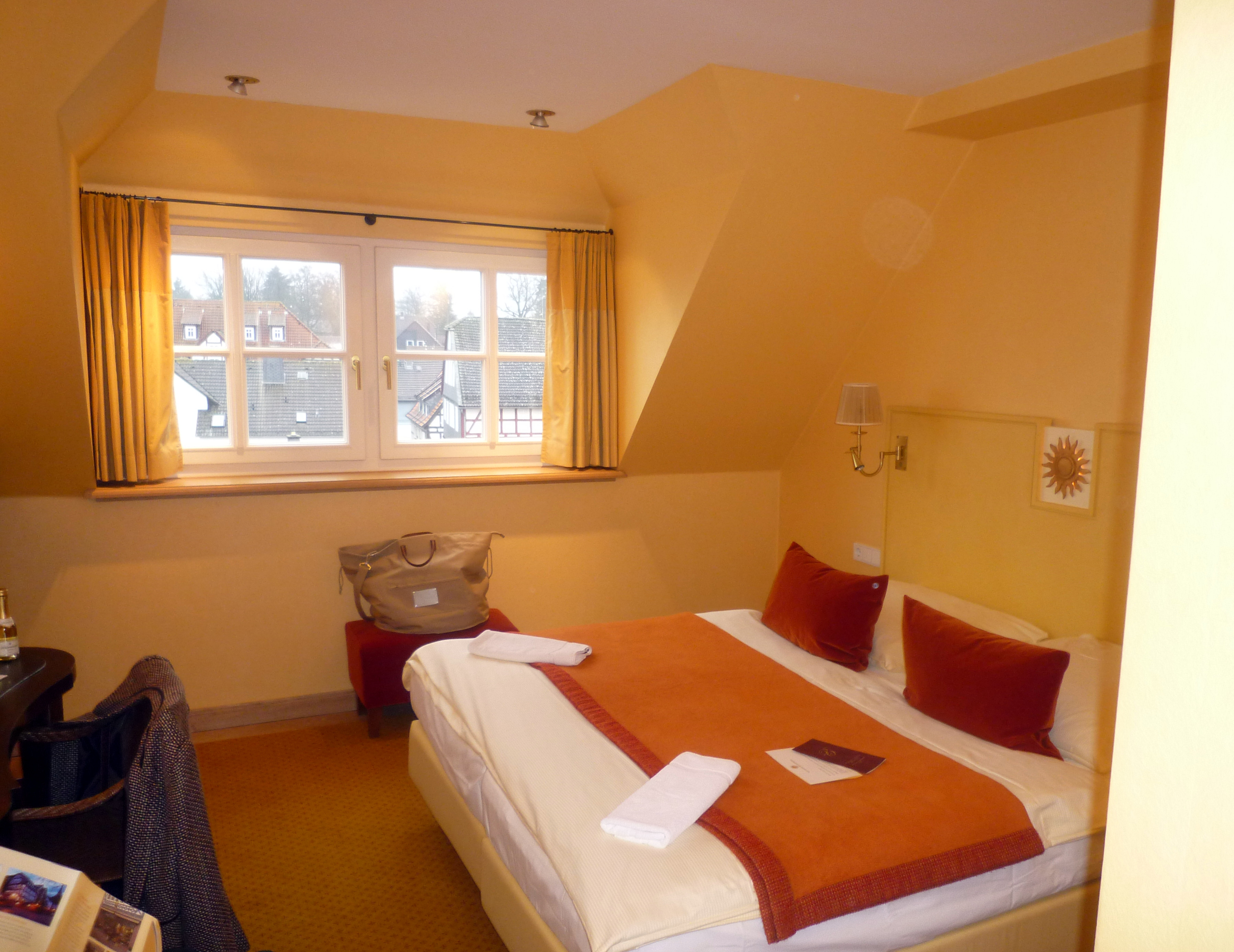 Die 60 Zimmer sind mit viel Liebe zum Detail und auch mit hochwertigen Materialien ausgestattet. Unser Zimmer im Dachgeschoss war großzügig geschnittenen und auch im Bad war genügend Platz vorhanden. Beim Betreten des Zimmers fiel ein sofort das mediterrane Wohnambiente in Sonnen-Gelber Farbharmonie ins Auge. Rote Bettdecken und die roten Sitzgelegenheiten bildeten einen interessanten Kontrast.