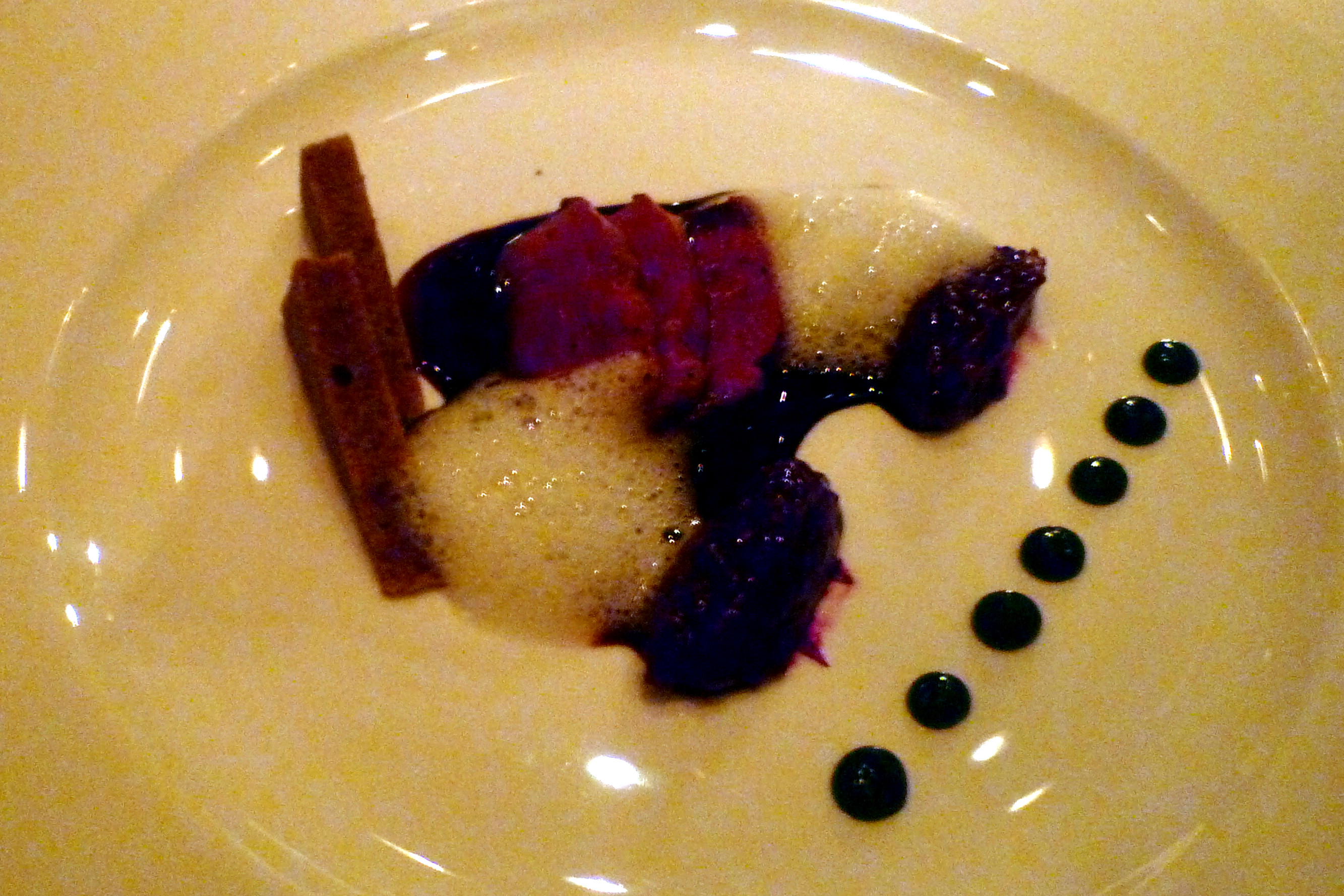 Gelungen, der beste Gang des Abends. Chefkoch Florian Hartmann brachte den Gang selbst an den Tisch. Das Wildfleisch auf den Punkt gegart. Dazu ein Früchtebrot und ein sehr gut gewürztes Rotkraut.