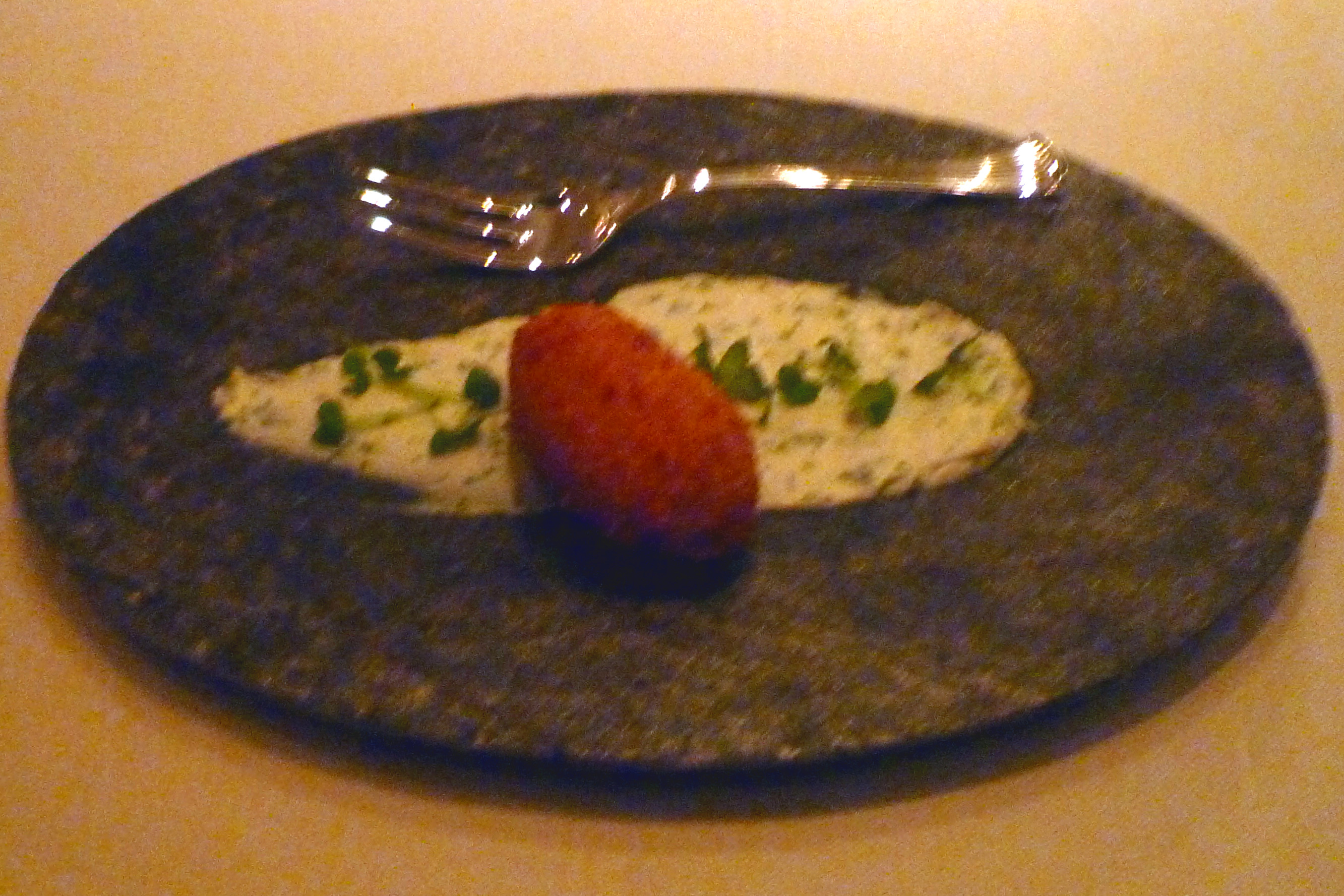 Ein kraftvoller und opulenter Auftakt. Mit 14 % Alkohol für einen Auftakt eines Menüs zu schwer. Der Wein konnte allerdings mit seinen Mineralien und seiner feinen Säure überzeugen.