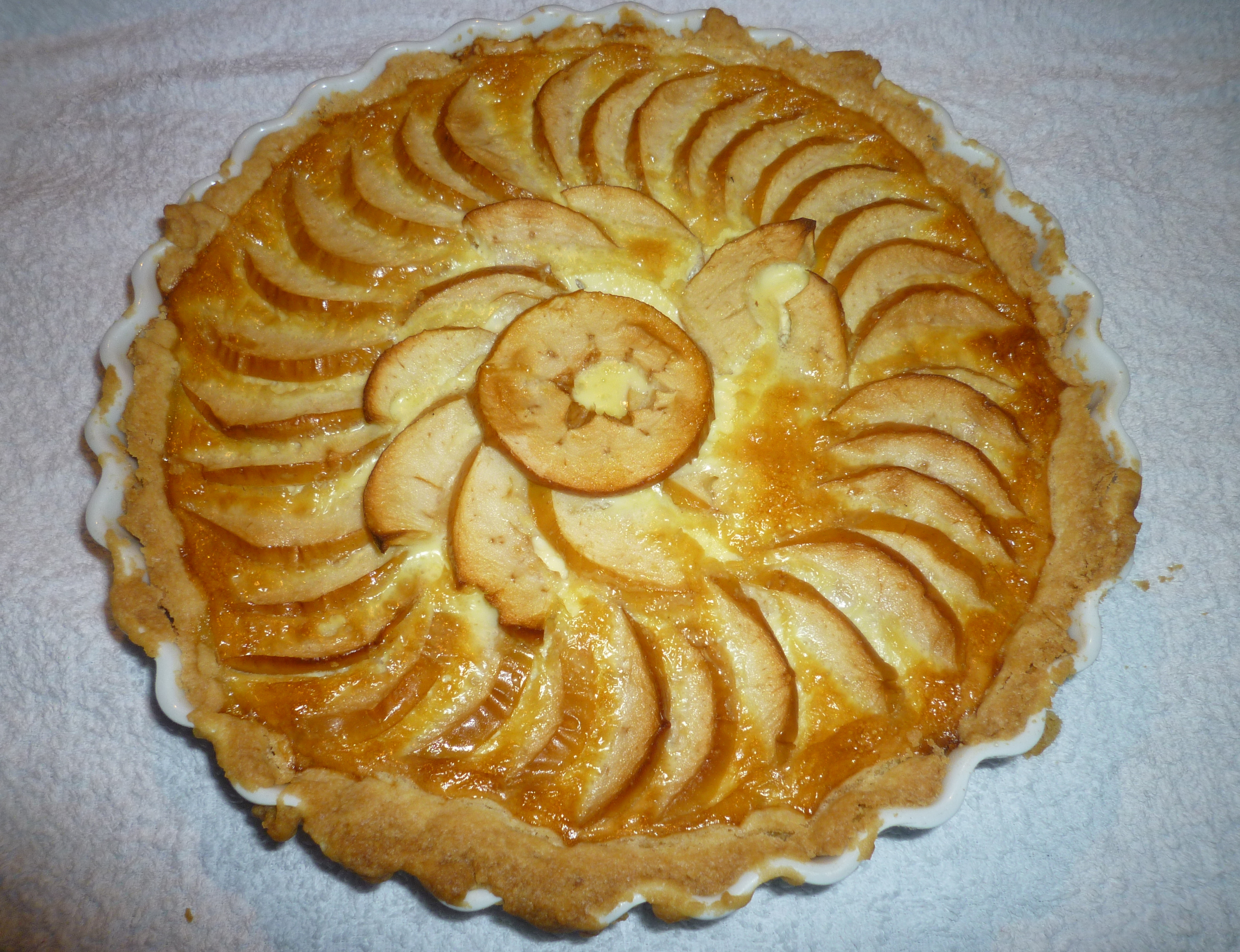 Die Eier-Sahne durch ein Sieb auf die Äpfel geben. Die Apfeltarte bei 180° C ca. 45 Minuten backen. Wichtig ist, dass die Füllung gar ist und nur minimal wabbelt, wenn man an die Form stößt.
