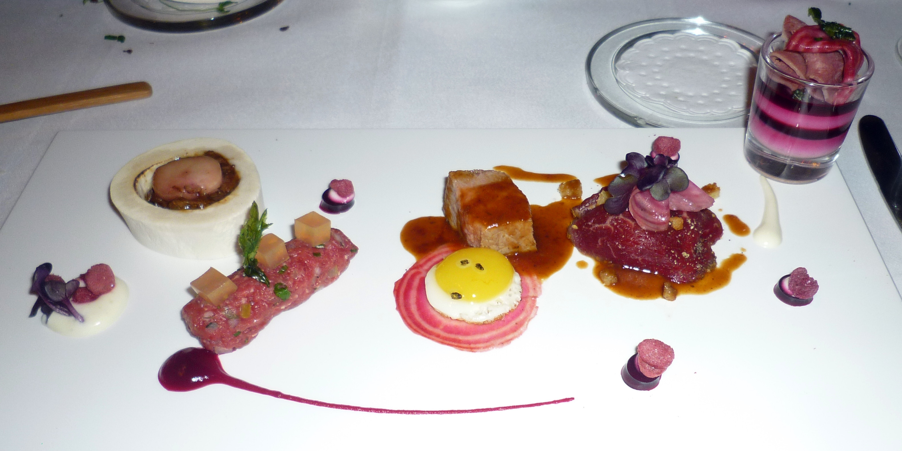 Höhepunkte im Menü:   Variationen vom Rind – OX hoch 5 – bunte Beete –  Sauerrahm  – Ei