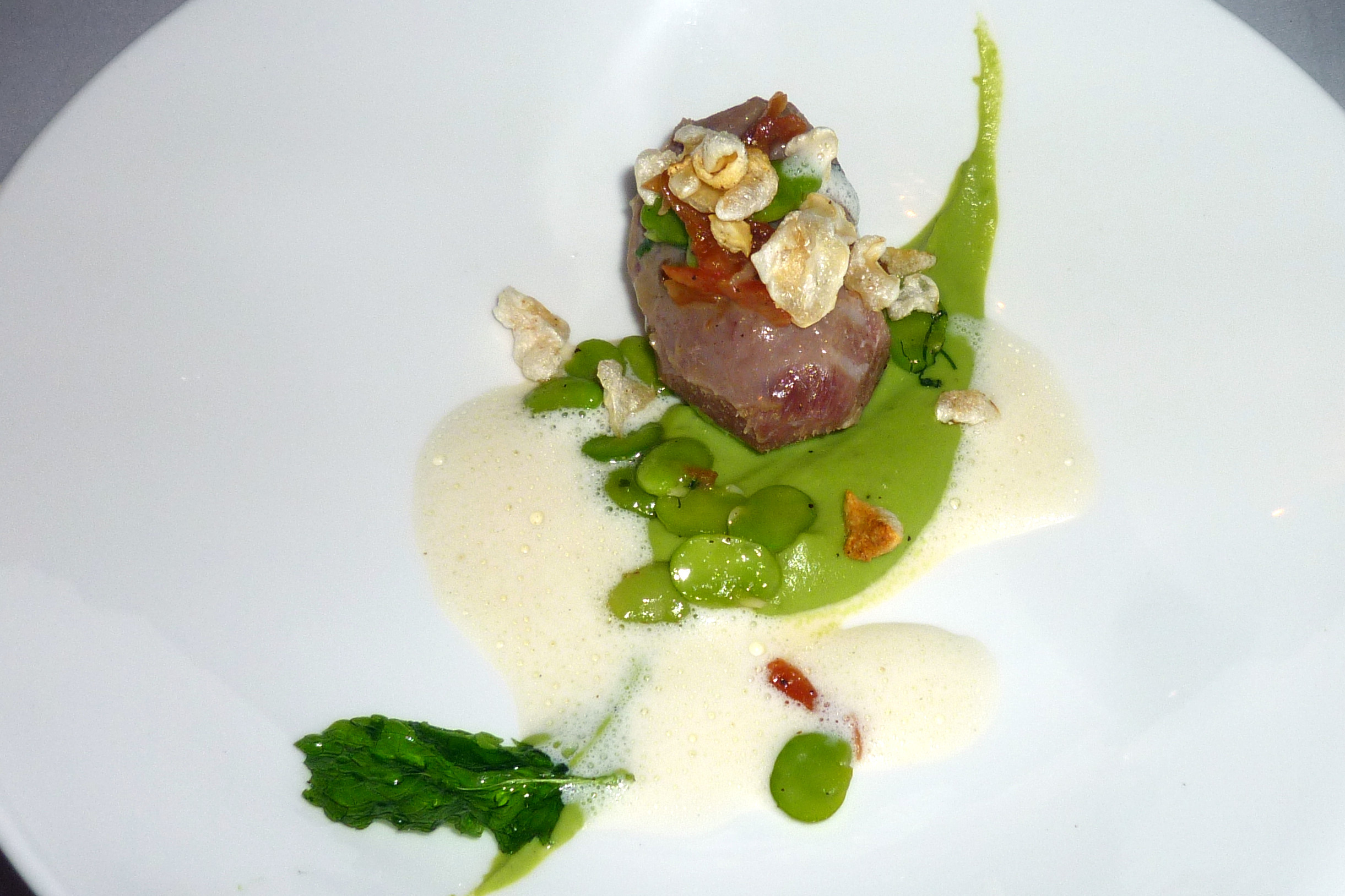 Fünfter Gang: Schweinebäckchen – Erbse – Minze – Popcorn.