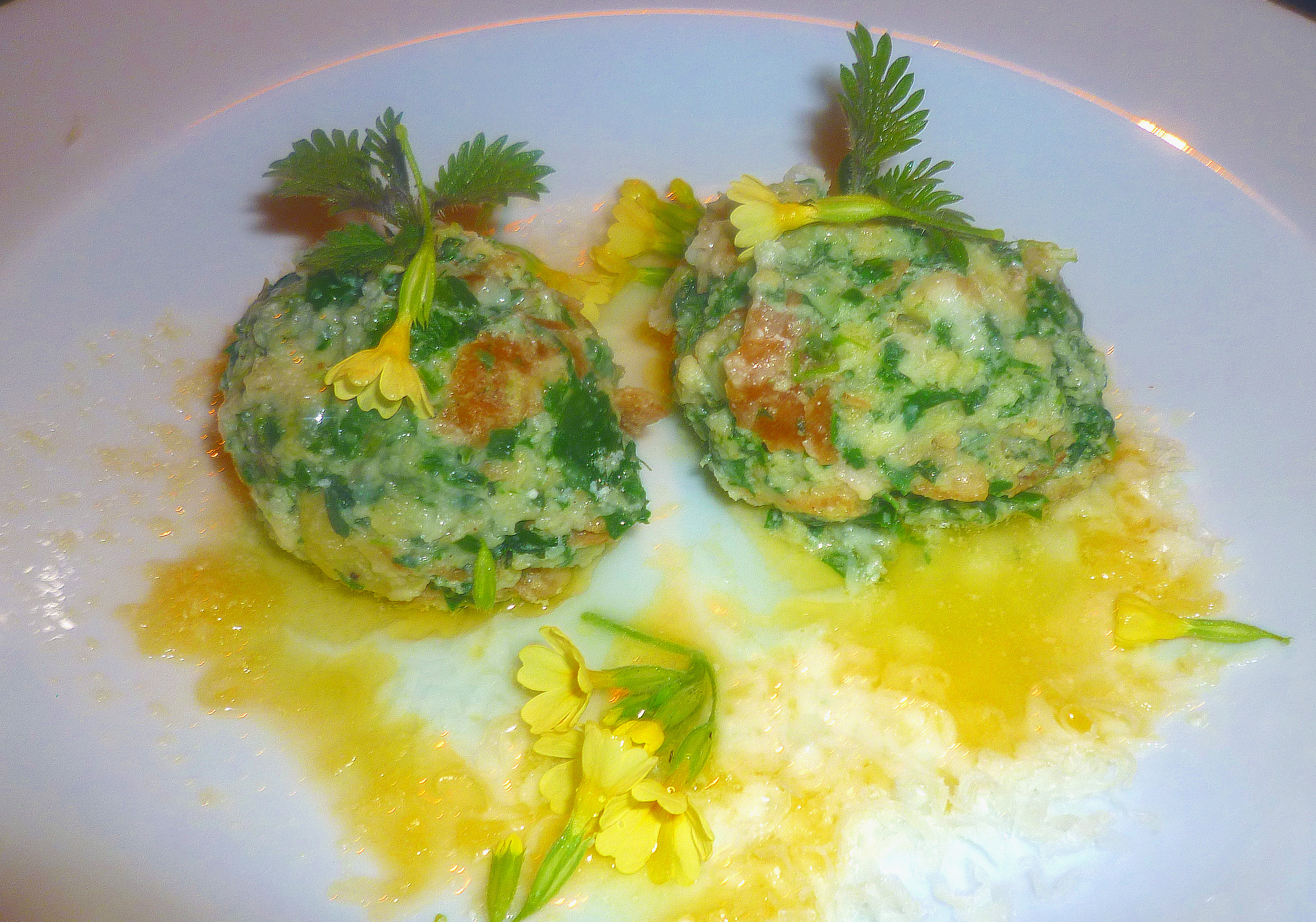 Das Ciabattabrot  kleinwürfelig schneiden und im warmen Backofen etwas trocknen lassen. Milch erwärmen und über das Brot geben.  Brennnesselblätter säubern und waschen. Kurz in einer heißen Pfanne zusammen fallen lassen. In Eiswasser abschrecken und abtropfen. Den feingeschnittenen Bauchspeck, Frühlingszwiebel, Knoblauch und Ingwer anziehen lassen und die feingehackte Petersilie unterheben und zu den Brotwürfeln geben.
