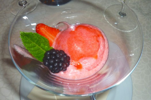 Die Eismaschine benötigt ca. 25 Min. für das Sorbet. Kurz vor Fertigstellung etwas Cilli in das Sorbet geben. Mit Minze garnieren.