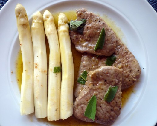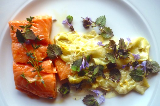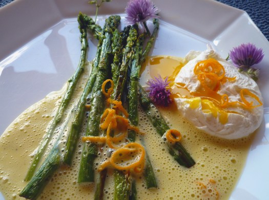 Der Spargel wurde über Dampf ca. 10 Min. gegart. Die Wildkräuter aus dem eigenen Garten wurden mit Zitronen-Olivenöl angemacht