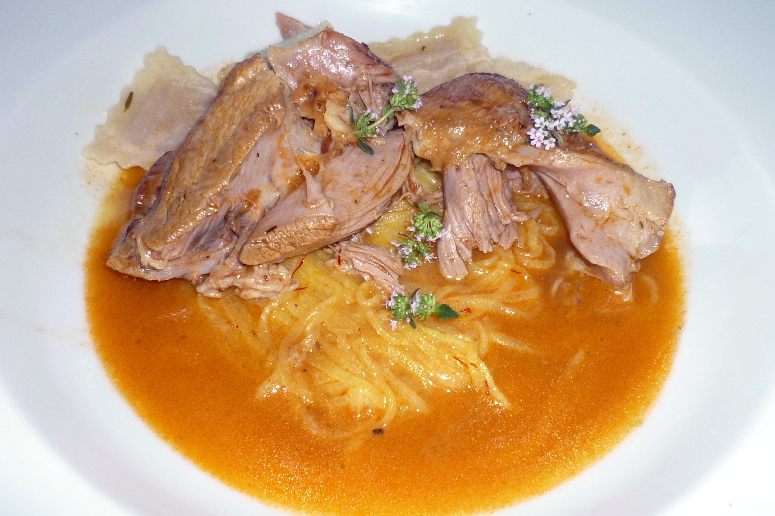 Seeteufel mit Griesflan und Spargel, Orangensauce