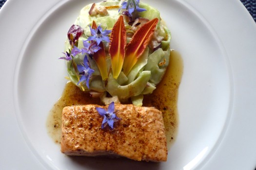 In eine beschichte Pfanne Olivenöl und Butter erhitzen und Rosmarin, Ingwer, Knoblauch dazu geben. Den Lachs auf der Hautseite ca. 3 Minuten knusprig braten. Dabei die Fleischseite immer wieder mit etwas Öl- Buttergemisch begießen. Den Lachs wenden, kurz braten, dann würzen und sofort servieren.