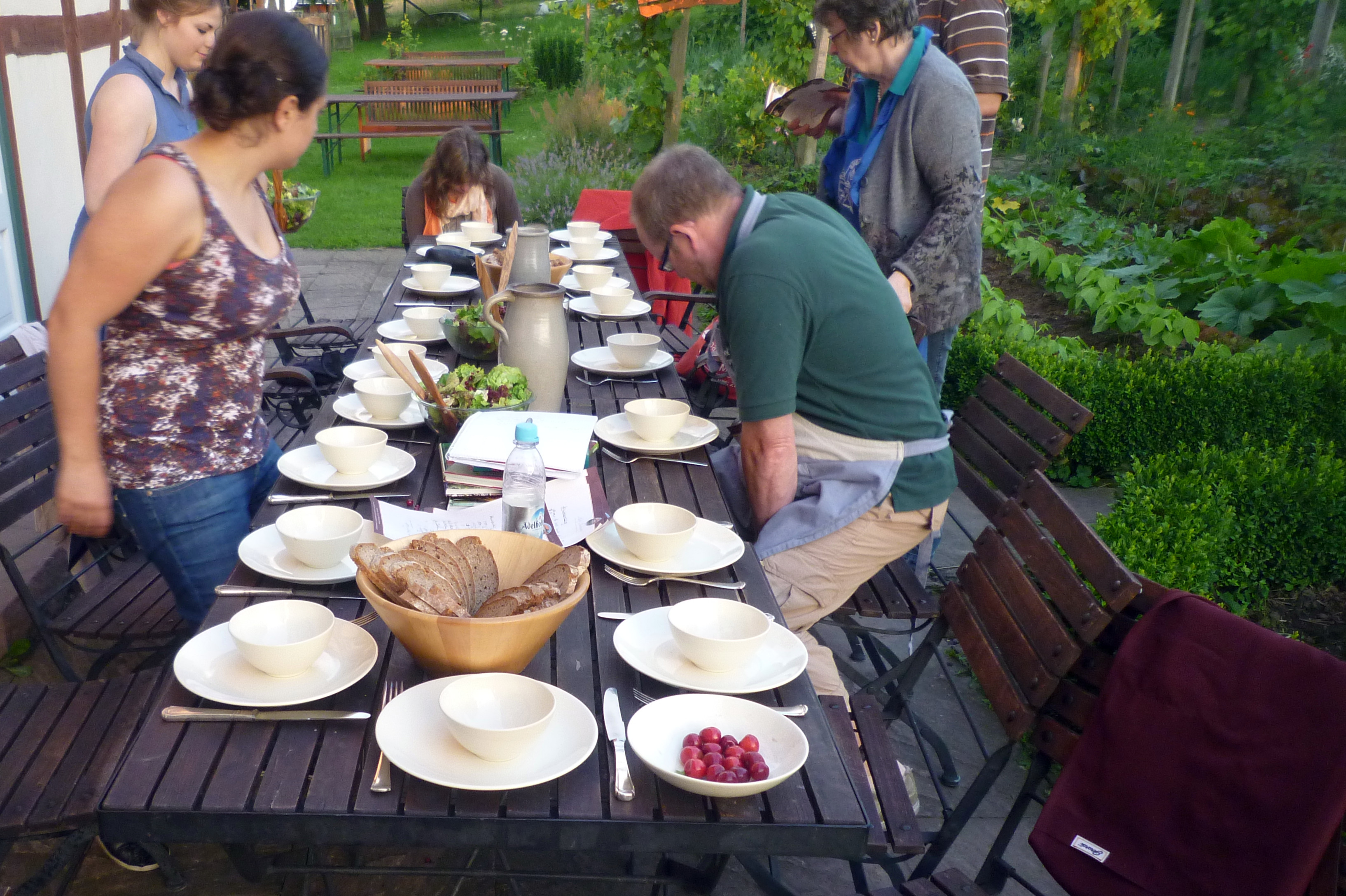 Beladen mit unserer Ernte ging es dann ab in die Küche. Kristina Bauer hatte vier Gerichte für uns heraus gesucht, die man dann in Gruppen zu viert vorbereitete. Nach ca. 2 Std. waren alle Zutaten verbraucht und wir setzten uns auf der Terrasse an die lange Tafel, um die selbst zubereiteten Gerichte zu verspeisen. Gegen 22,30 Uhr war dann alles ver-speist und wir machten uns auf den Heimweg.