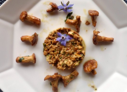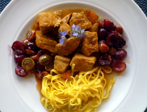 Die Kirschen entsteinen, die Stachelbeeren putzen. Zucker karamellisieren und die Kirschen dazu geben. Mit Kirsch-wasser ablöschen, einkochen lassen. Zum Schluss die halbierten Stachelbeeren dazu geben.