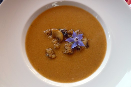Die gut gekühlte Gazpacho mit den gerösteten Brotwürfeln servieren.