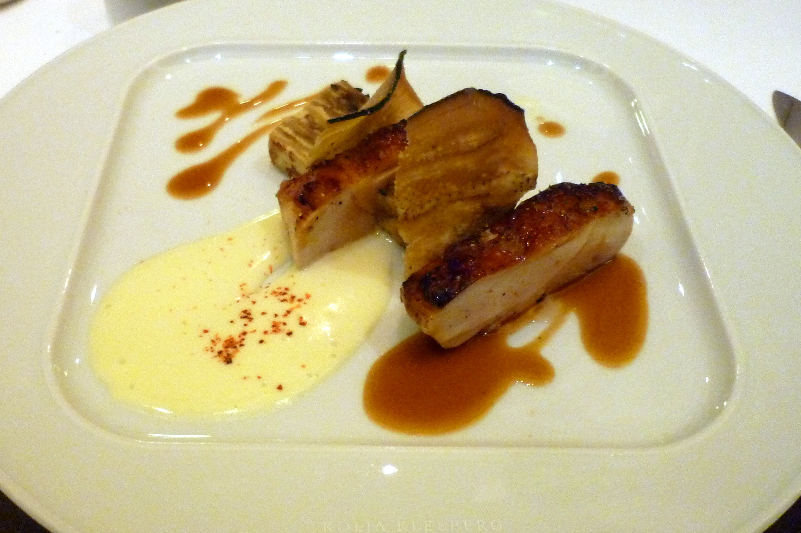 Gut gebratenes Fleisch mit fester Struktur, einem leichten säuerlichen Geschmack und krosser Haut. Relativ kleine Auberginentarte und von der Würze her ein ausbalancierte Olivenölschmand.