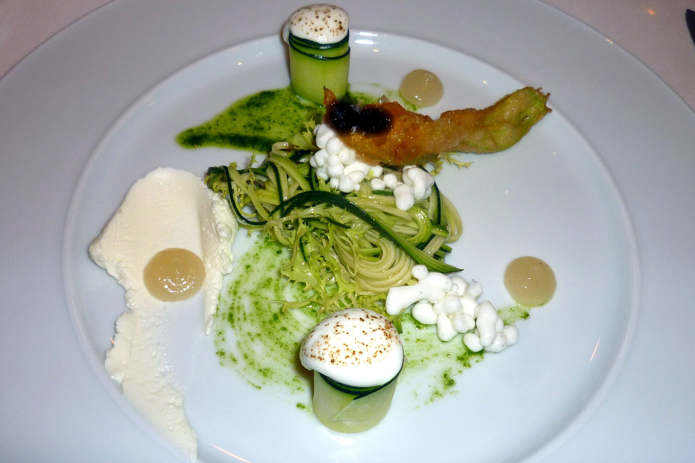 Ziegenkäse und Honig passen fast immer. Zucchini-blüte und „Zucchininudeln“, waren erfrischende Begleiter zum Käse.
