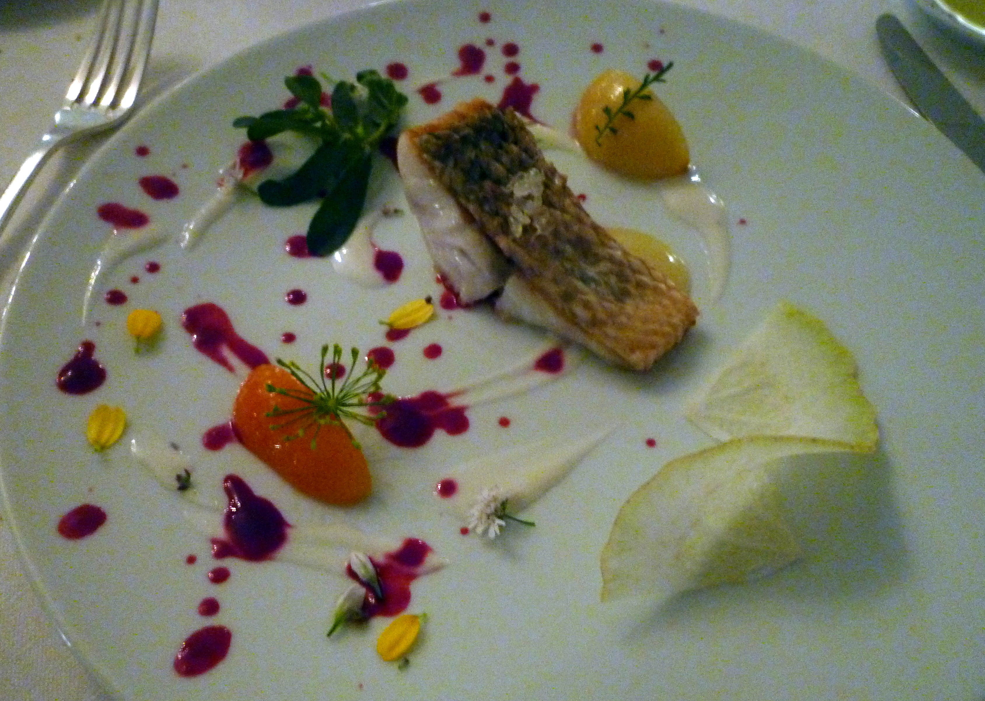 Loup de mer mit roter Beete : Der Fisch noch leicht glasig und mit einer krossen Haut. Dazu Kumquats und Creme fraiche mit Zitrone abgeschmeckt. Die rote Beete als „Kleckse“ auf dem Teller verteilt. Dazu Kräuter und Sprossen. Ein harmonischer und gut abgeschmeckter Gang.