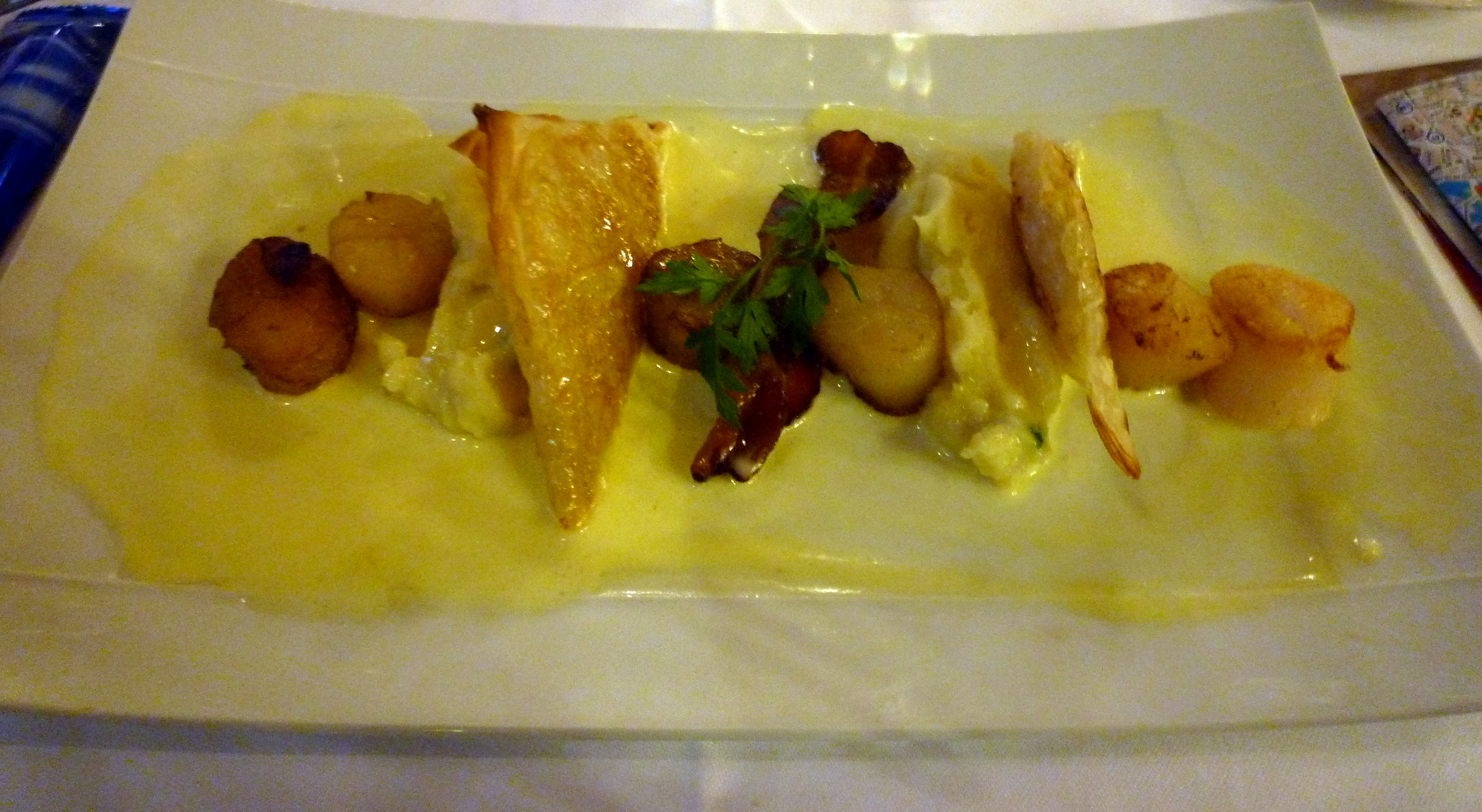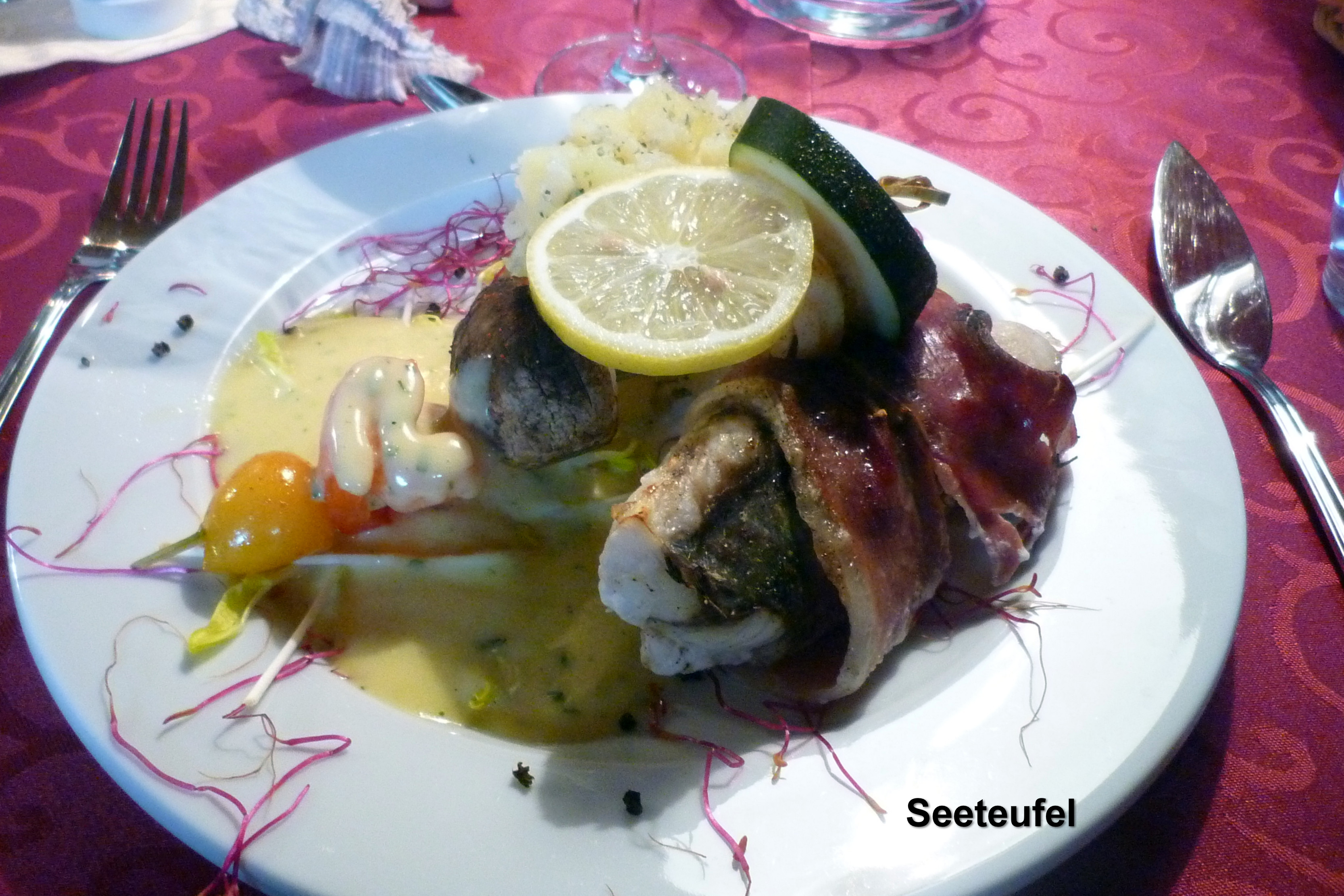 Den gesamten Vormittag an der frischen Luft, das macht natürlich Hunger. Andy hat wieder aufgetischt. Heute gibt es: Jakobsmuscheln mit Gemüse, Seeteufel im Schinkenmantel mit Gemüsespies und Sauce Hollandaise sowie als Dessert ein Mangosorbet.