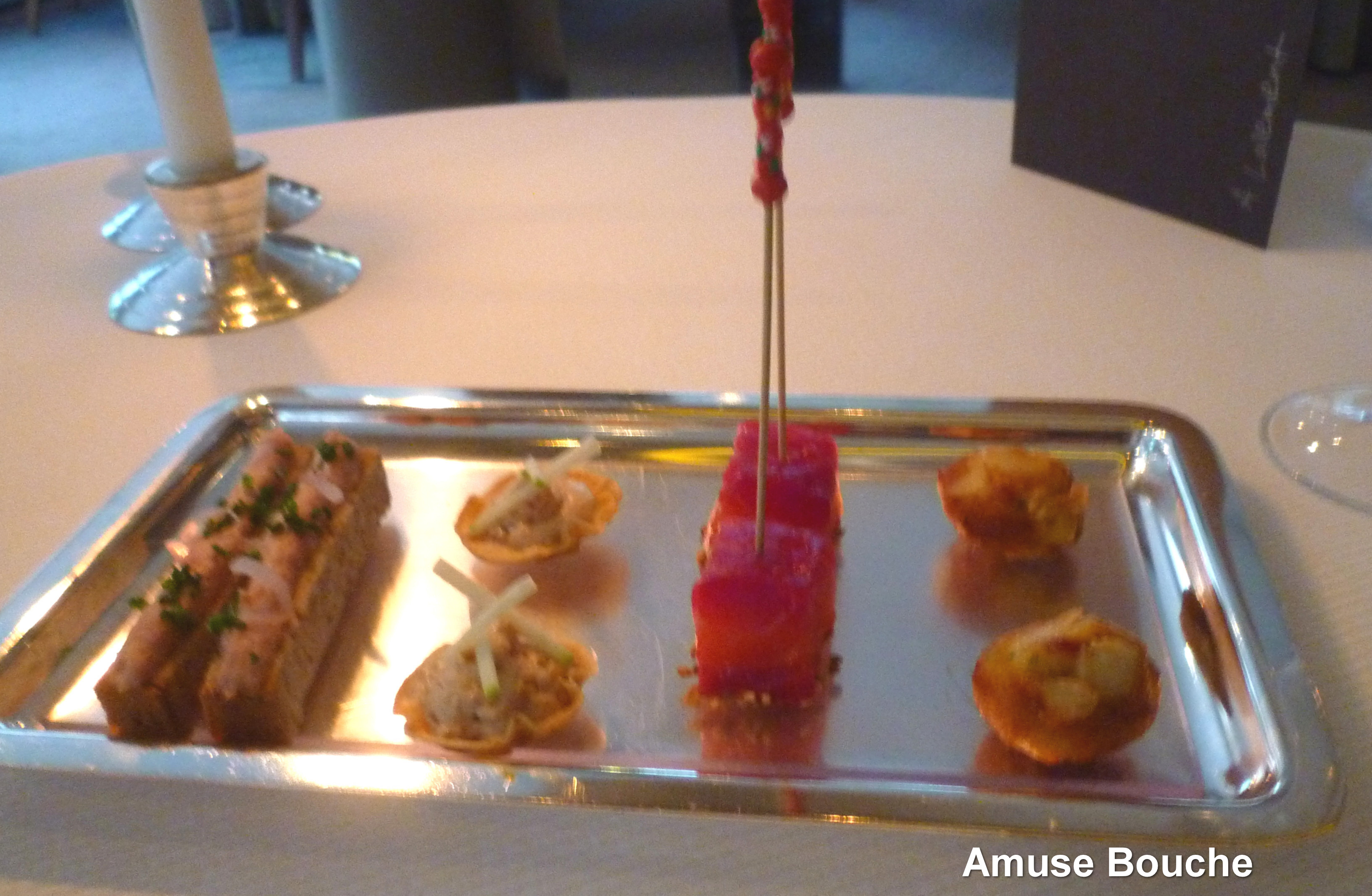 Zu dem Aperitif wurden vier Kleinigkeiten Aufgetragen. Sehr gut der Thunfisch und die Gänselebercreme.