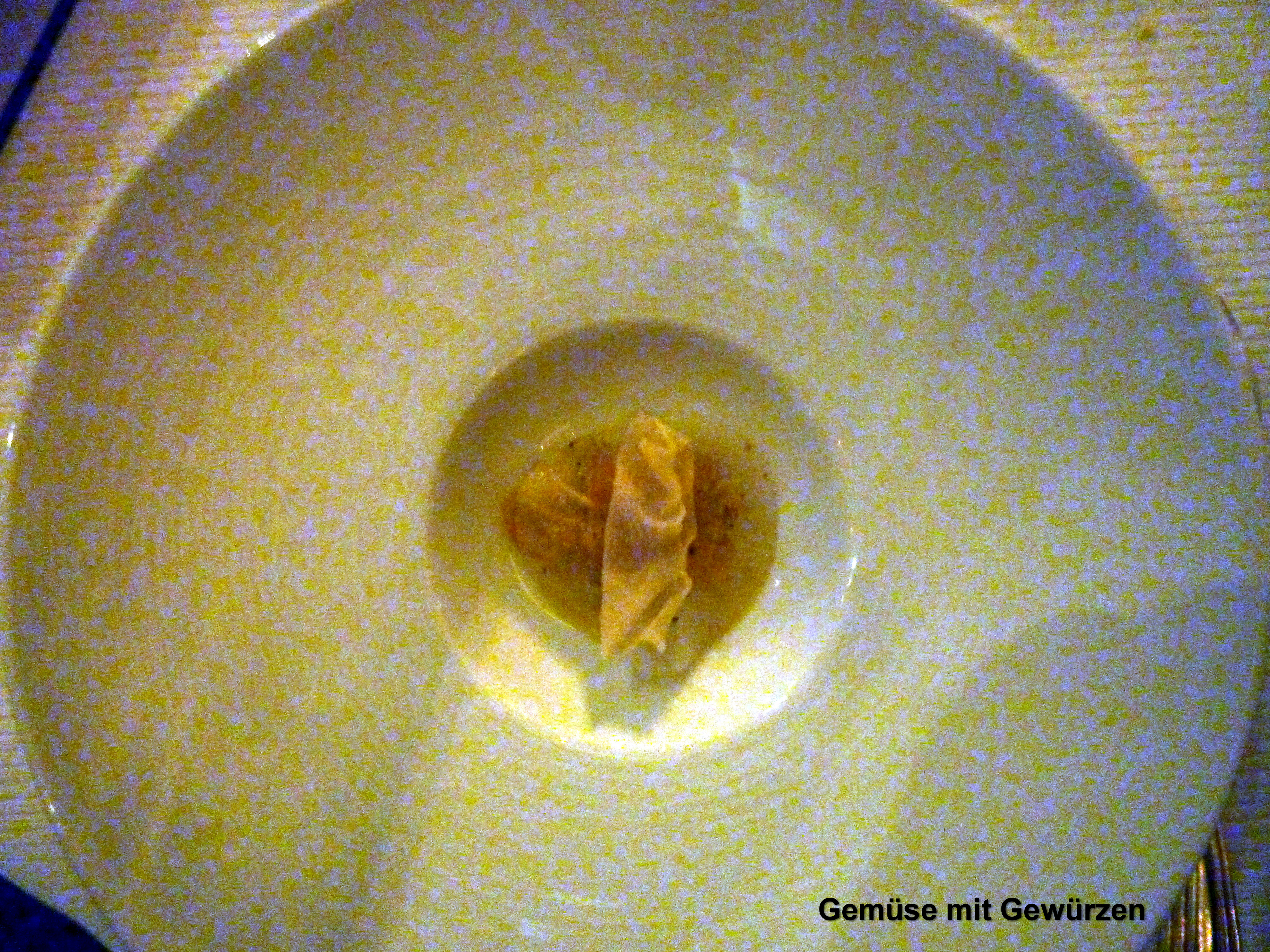 Beim nachfolgenden Menü kam für uns viel Neues auf dem Tisch. Interessanteste Neuigkeit war das Servieren der Gänge auf jeweils 2 Tellern. Auf einem Teller die Hauptzutat, auf dem anderen die Beilagen. Auf dem Tisch wurde es oft sehr eng da die Teller auch Ø von über 30 cm hatten.