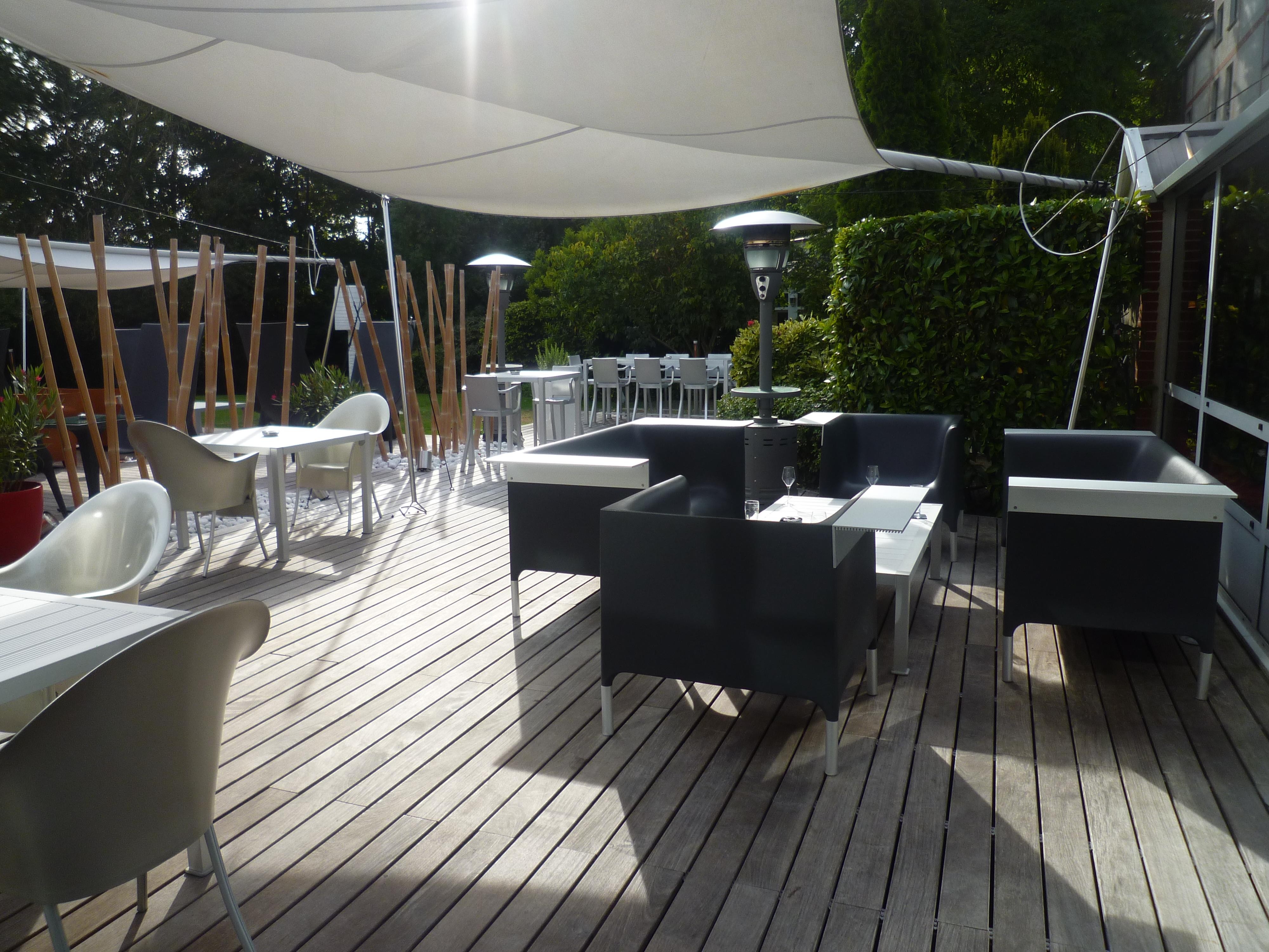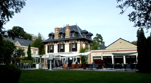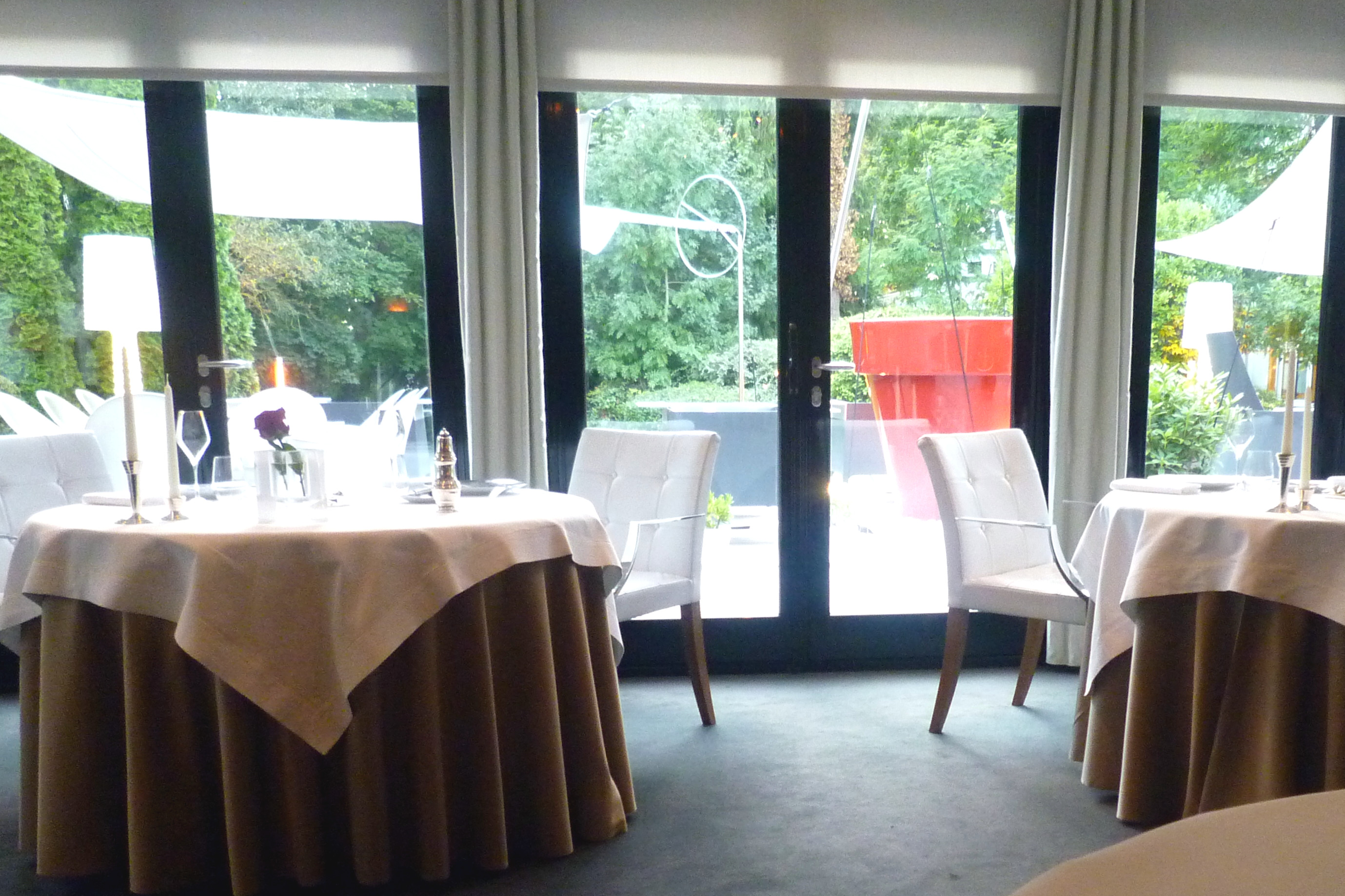 Der Abend begann mit einem Champagner von Krug für Madam, ich selbst begnügte mich mit einem Pastis als Aperitif. Von unseren Tisch hatten wir einen schönen Blick in Garten bzw. auf die Terrasse. Die 10 Tische sind in einem großzügigen Abstand voneinander gestellt. Der Restaurantraum, mit einer großen Fensterfront, wirkt mit seinen weiß eingedeckte Tische sehr großzügig. Lediglich die Beleuchtung konnte uns nicht gefallen. Es fehlte einfach die Grundbeleuchtung, die Tischbeleuchtung bestand lediglich aus Kerzenschein. Architektonisch ausgezeichnet, aber um zu sehen was serviert wurde sehr schlecht.