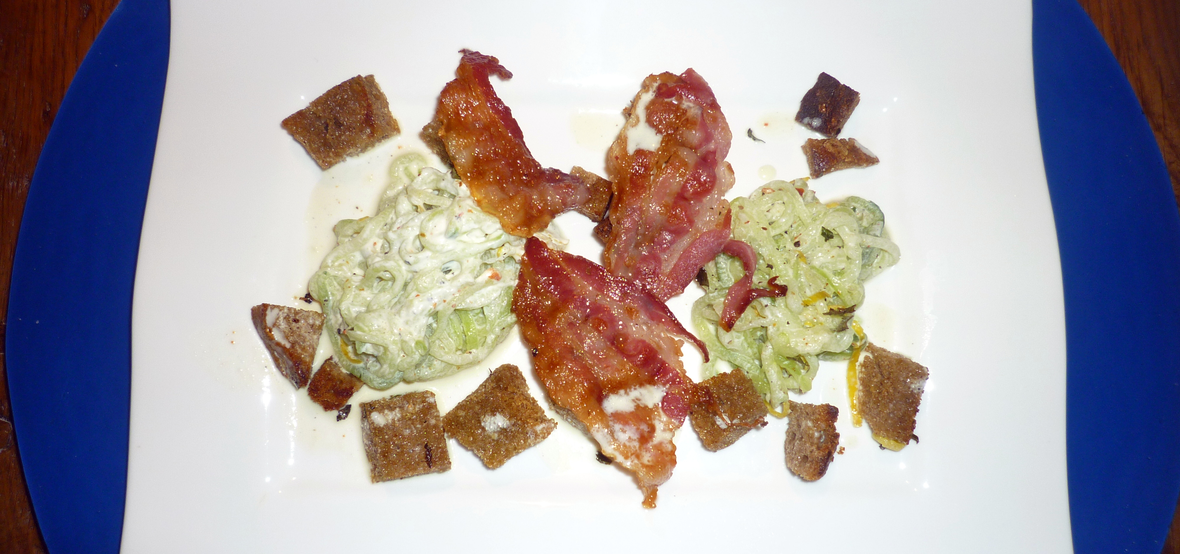 Mit Hilfe einer Gabel die Gurkenstreifen aufwickeln und dekorativ auf einen Teller setzen. die knusprigen Brotstücke anlegen und mit dem krossen Speck ausdekorieren. Den restlichen Schmandsaft auf den Teller verteilen.