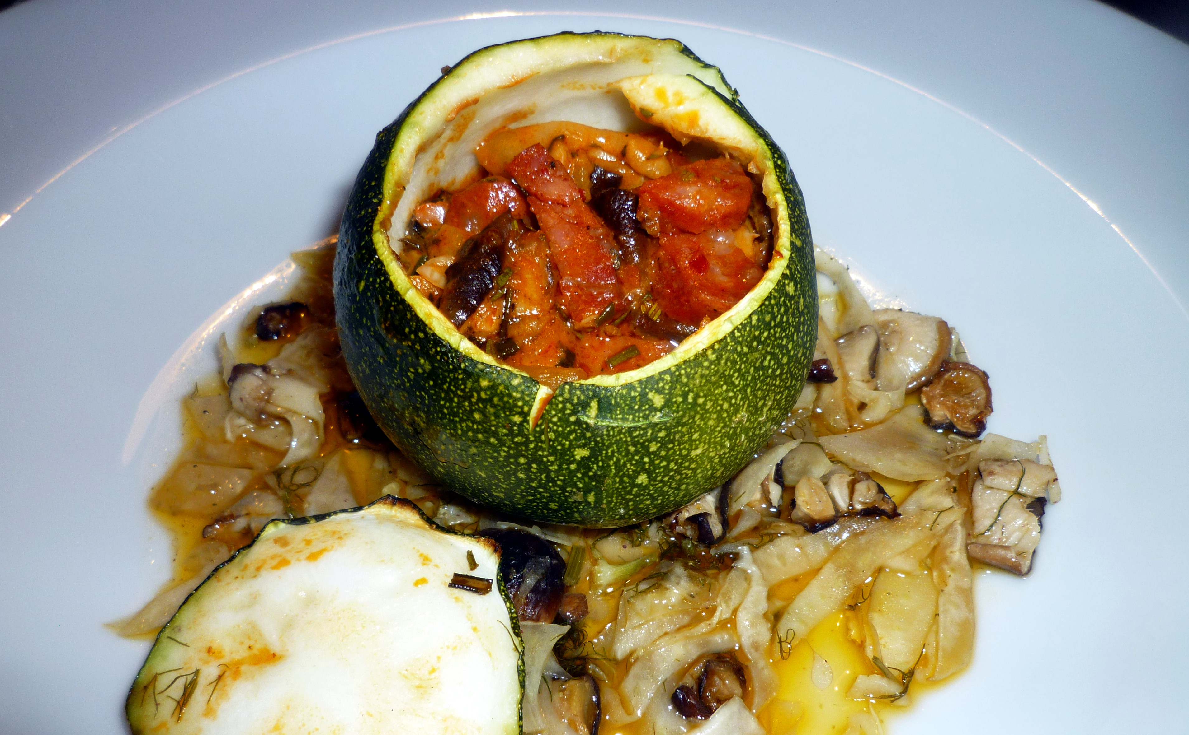 Gefüllte Zucchini auf Fenchel-Pilzgemüse.