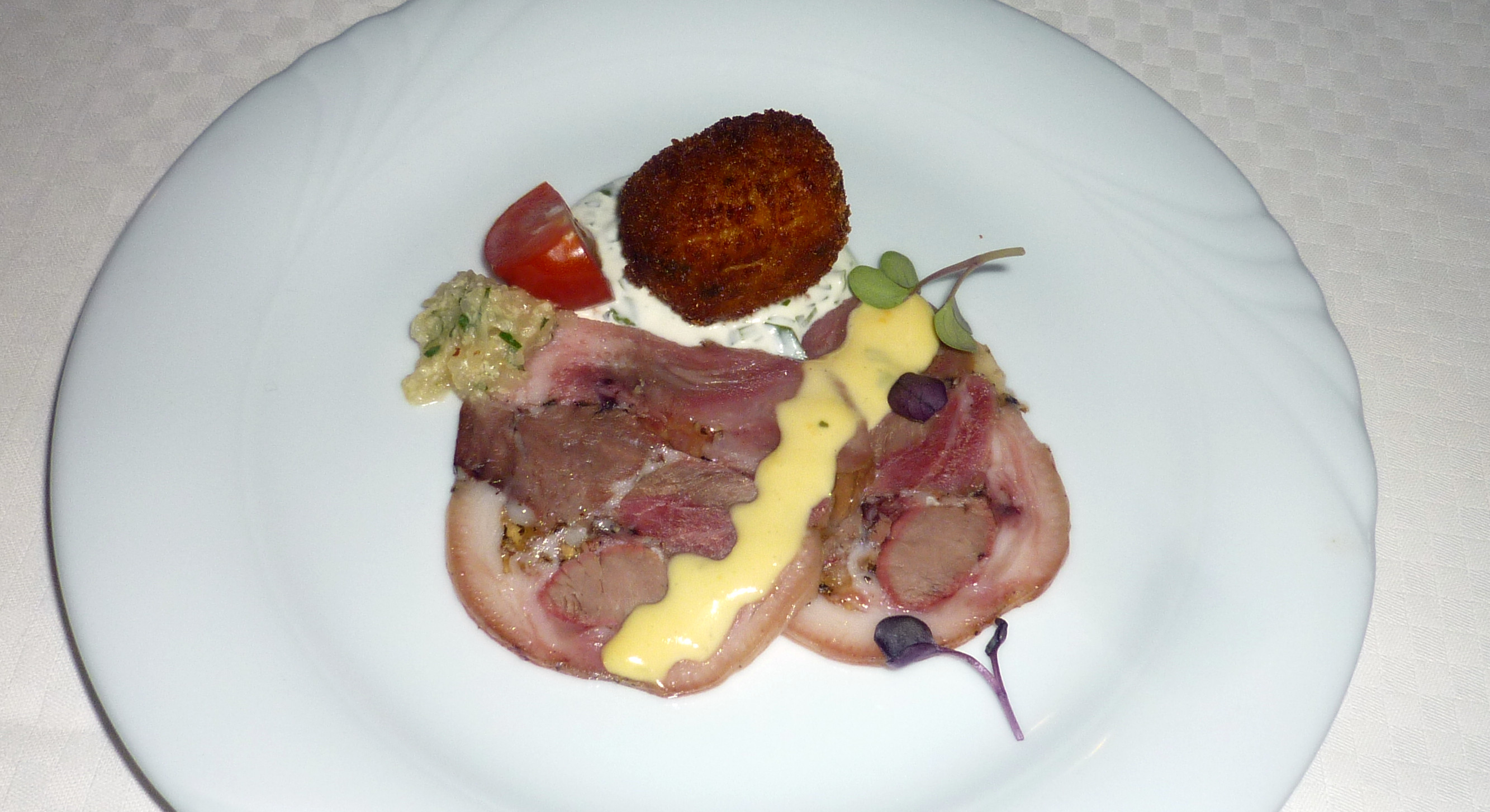 Zu den Klassikern der Jägerstube gehört der gefüllte Lammrollbraten, diesmal mit Ratatouille und gebratenen Beutelches Scheiben. Dazu eine sehr gehaltvolle Lammsauce. Eine sehr große Portion die da auf dem Teller lag. Man hatte Mühe alles aufzuessen.