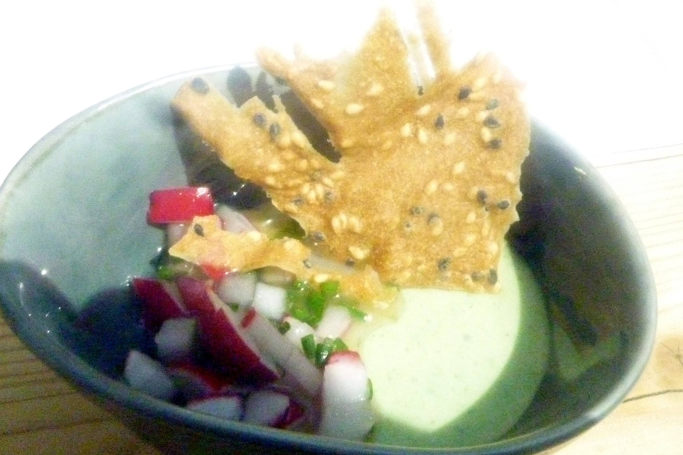 Als Aperitif einem Winzersekt, dazu wohlschmeckendes Brot mit Salzbutter. Als Amuse Bouche dann eine Bärlauchmousse mit einer Radieschenvinaigrette, ein angenehmer frischer Auftakt.