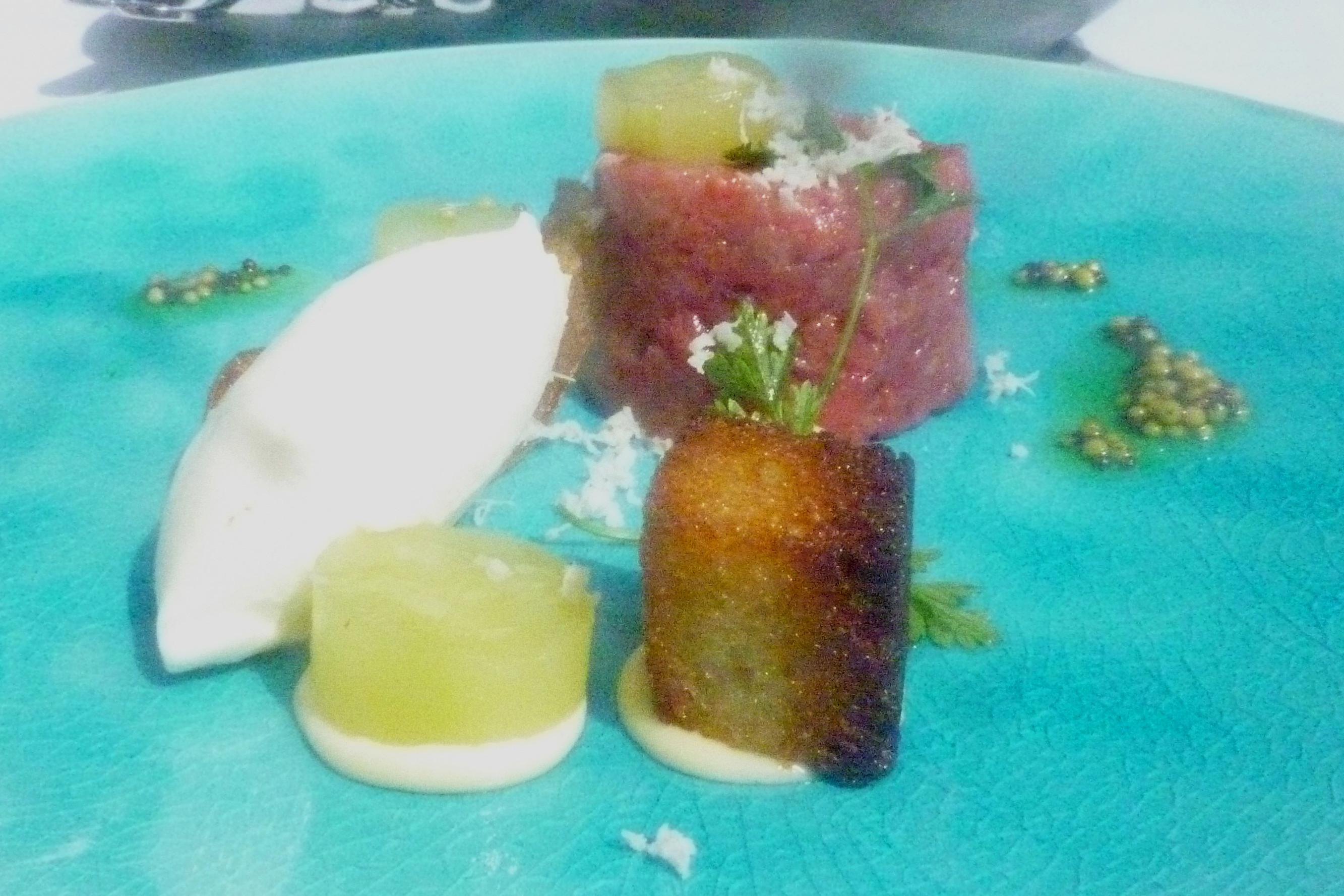 Rinder Tatar mit Meerrettich Sorbet und eingelegten Gurken. Das Tatar war sehr gut gewürzt und harmonierte hervorragend mit dem schmelzigen Sorbet. Die Gurken brachten eine gewisse Säure mit ins Spiel, dazu noch ein knuspriger Brotwürfel.