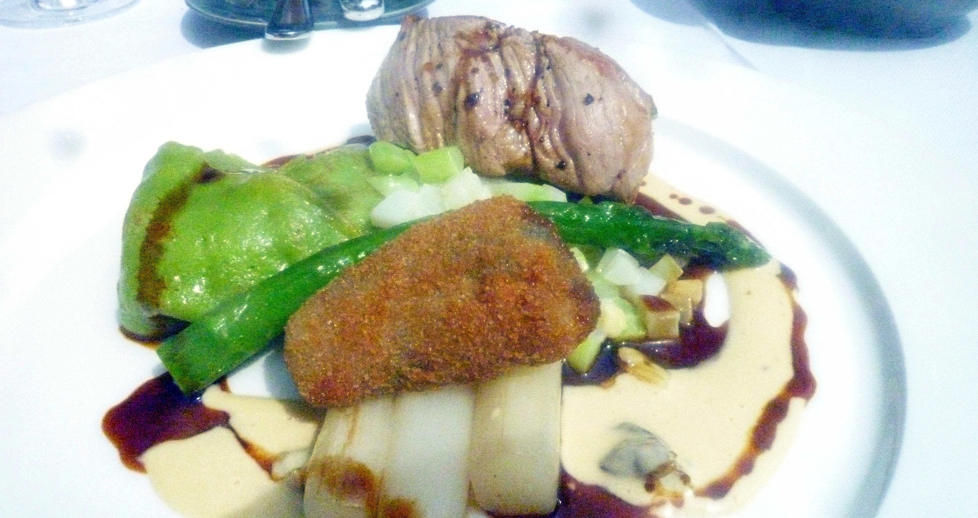 Der Jahreszeit angepasst dann der nächste Gang. Weißer und grüner Spargel, Bärlauch Nudeln, Kalbfilet. Der Spargel mit sehr angenehm Biss und das Filet auf den Punkt gebraten. Dazu zweierlei Saucen, eine dunkle Braten- und eine helle Spargelsauce. Dazu ein Rotwein aus dem Bordeaux. Warum Bordeaux? Wir sind in Baden und Baden hat sehr gute Rotweine.