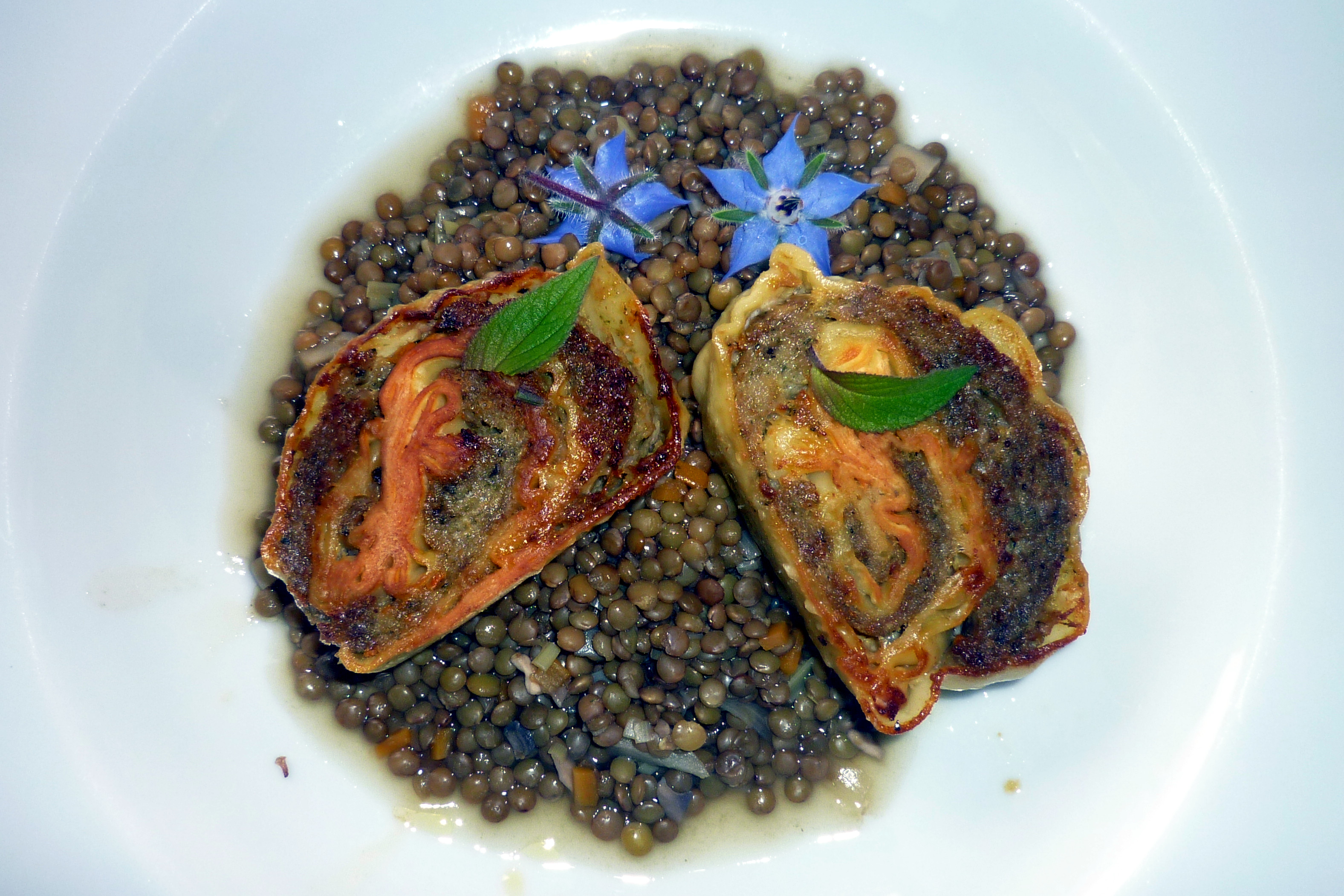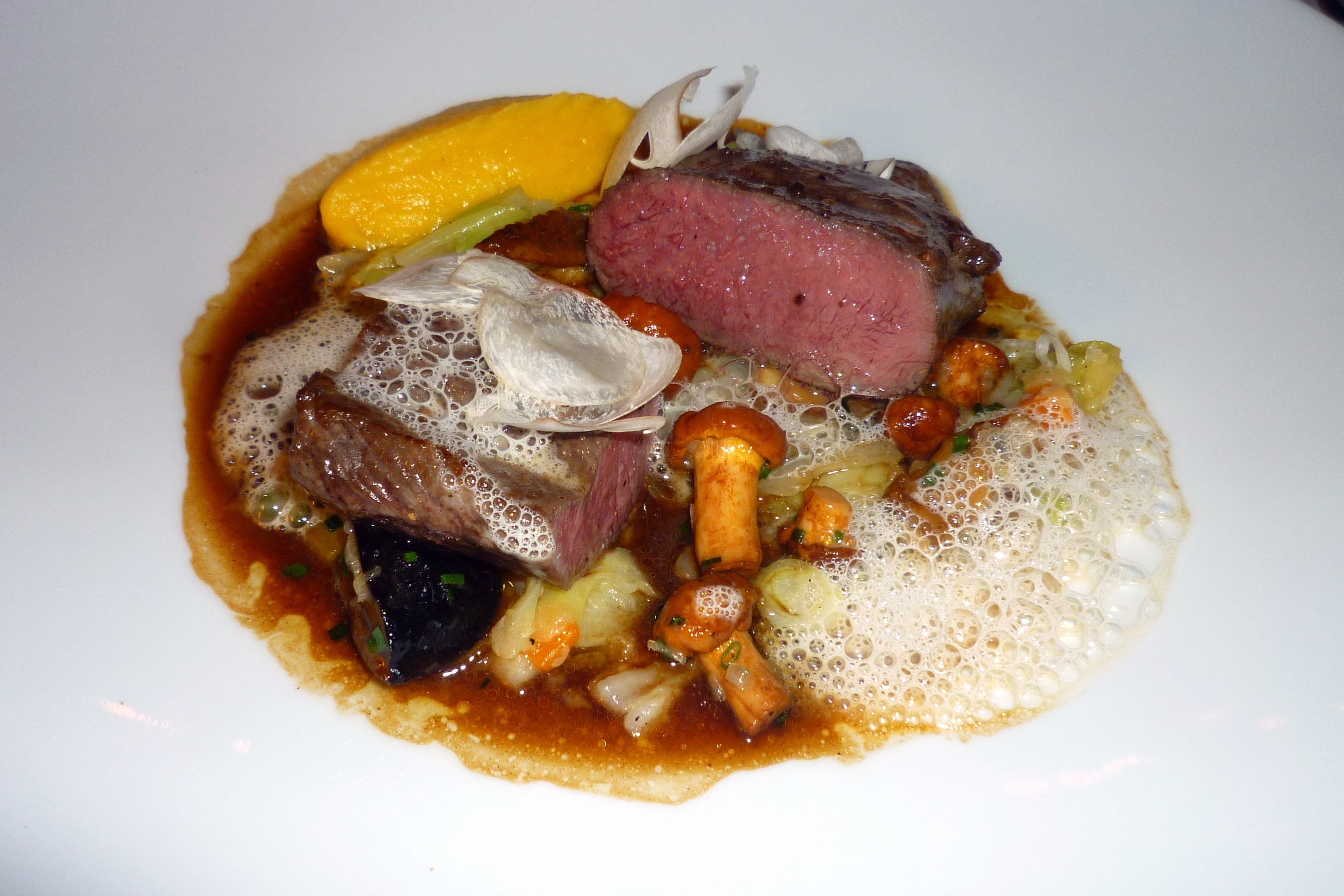 Aus dem Menü ist besonders der Fisch- und Fleischgang hervorzuheben. Beim Auftragen der Seezunge und Hummer mit Steinpilzen strömte ein betörender Geruch von Pilzen in unsere Nase. Hauchdünne Steinpilzscheiben bedeckten das Gericht, dazu gebratene Steinpilze und die Sauce war auf Pilzsud aufgebaut. Der beste Gang des Abends.