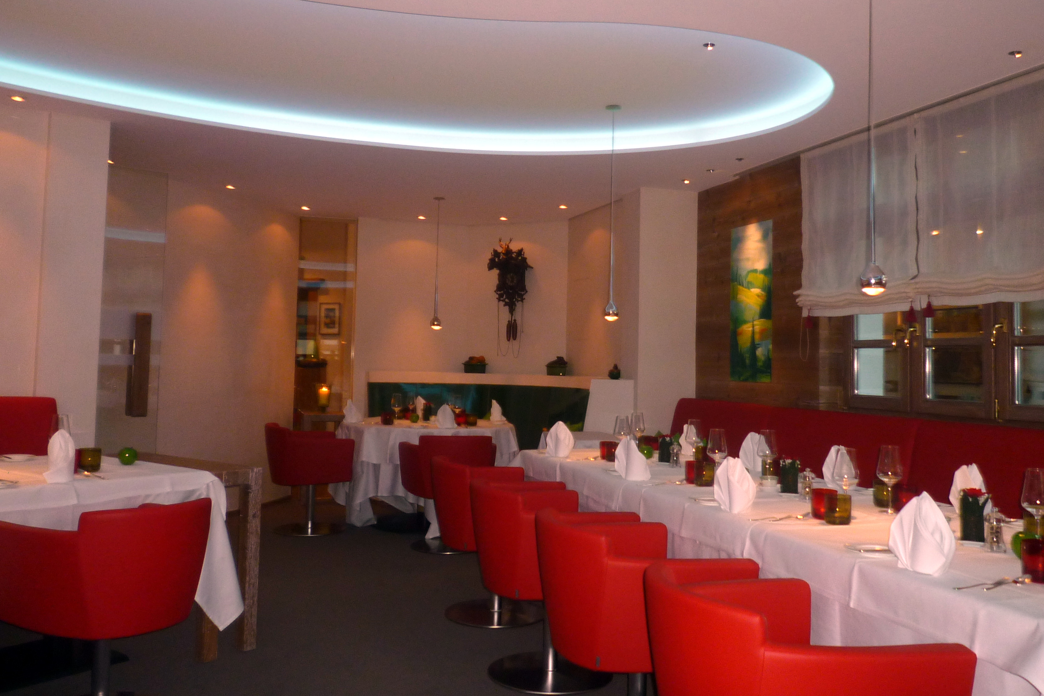 Das Gourmet Restaurant erstrahlt in einem modernen Schwarzwald-Look. Moderne und klassische Elemente sind elegant miteinander kombiniert. Die Bestuhlung in einem strahlendem rot wie die Bollenhüte der unverheirateten Frauen des Schwarzwaldes. Fußboden und Teile der Wände in einem angenehmen Holzton. Einige Geweihe zeigen die Jagdleidenschaft des Juniors an. Natürlich darf auch eine Kuckucksuhr nicht fehlen.