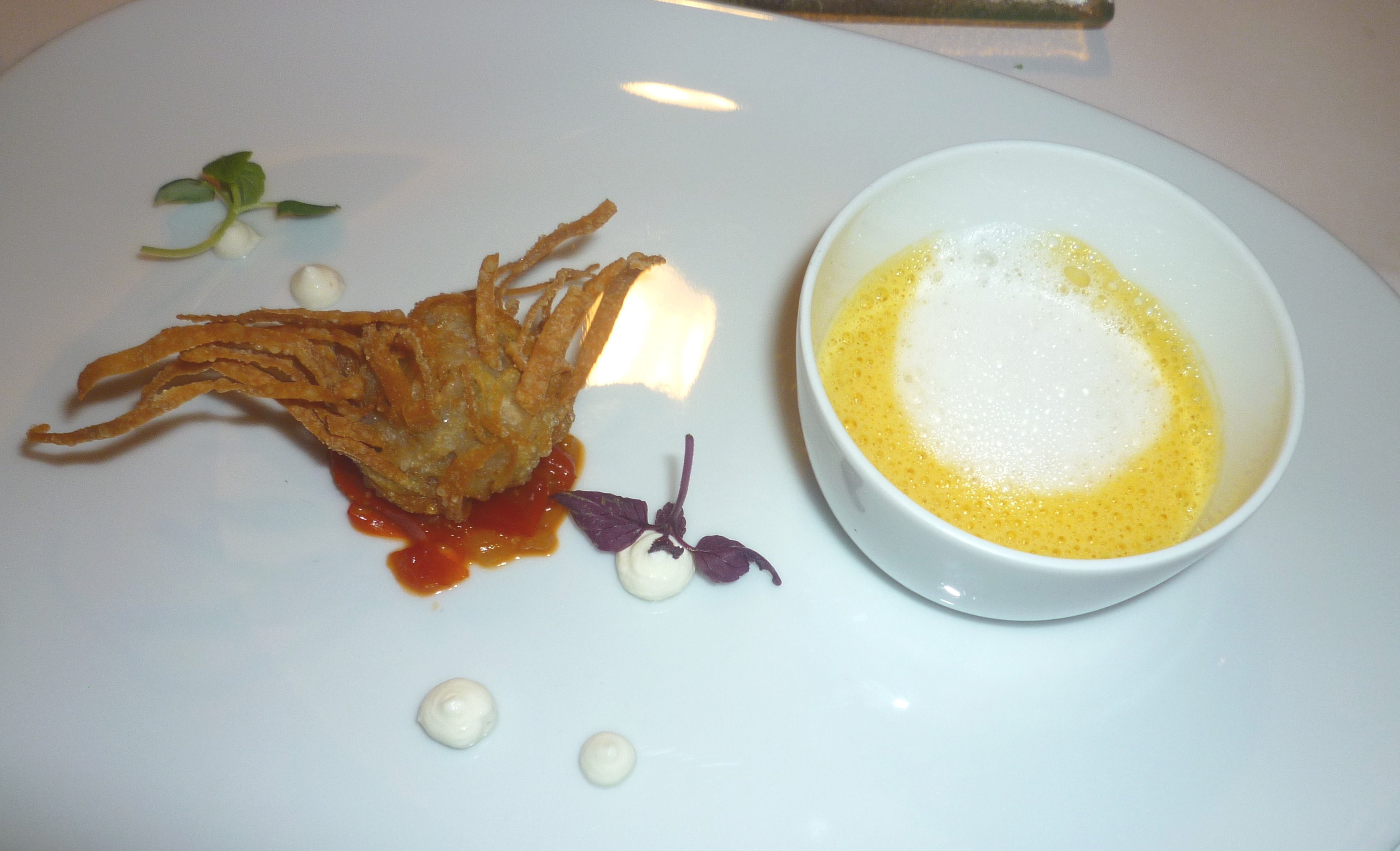 Es werden zwei Menüs angeboten. Ein Jahreszeiten-Menü und das Adler-Menü. 3 Gänge kosten 58,- € und 7 Gänge 120,- €. Ich selbst wählte eine 5 Gang Menü für 92,- € aus. Die Weinreise kostet pro Gang 9,- €/ 0.1 l.