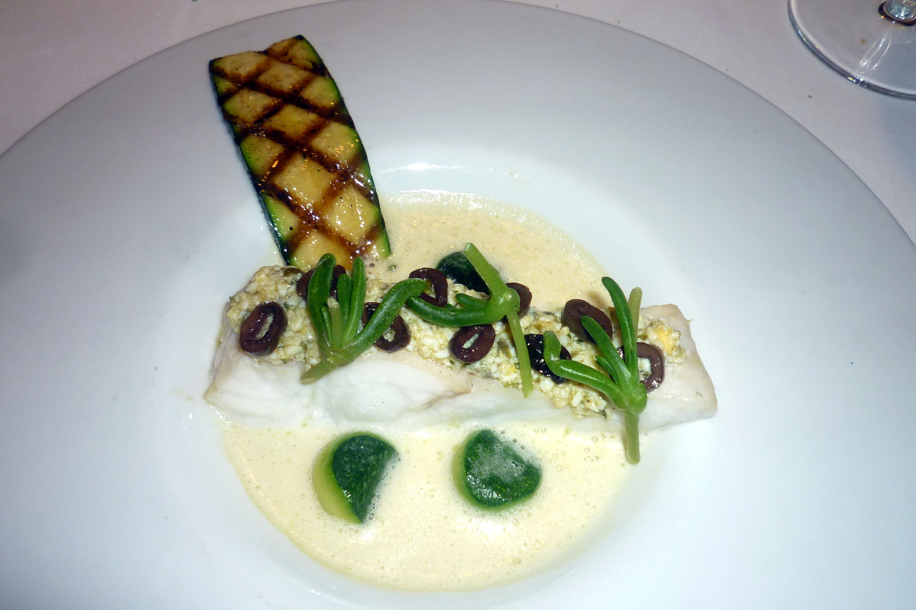 Steinbutt pochiert mit Oliven, gekochtem Ei und Zucchini. Der Fisch auf den Punkt gegart