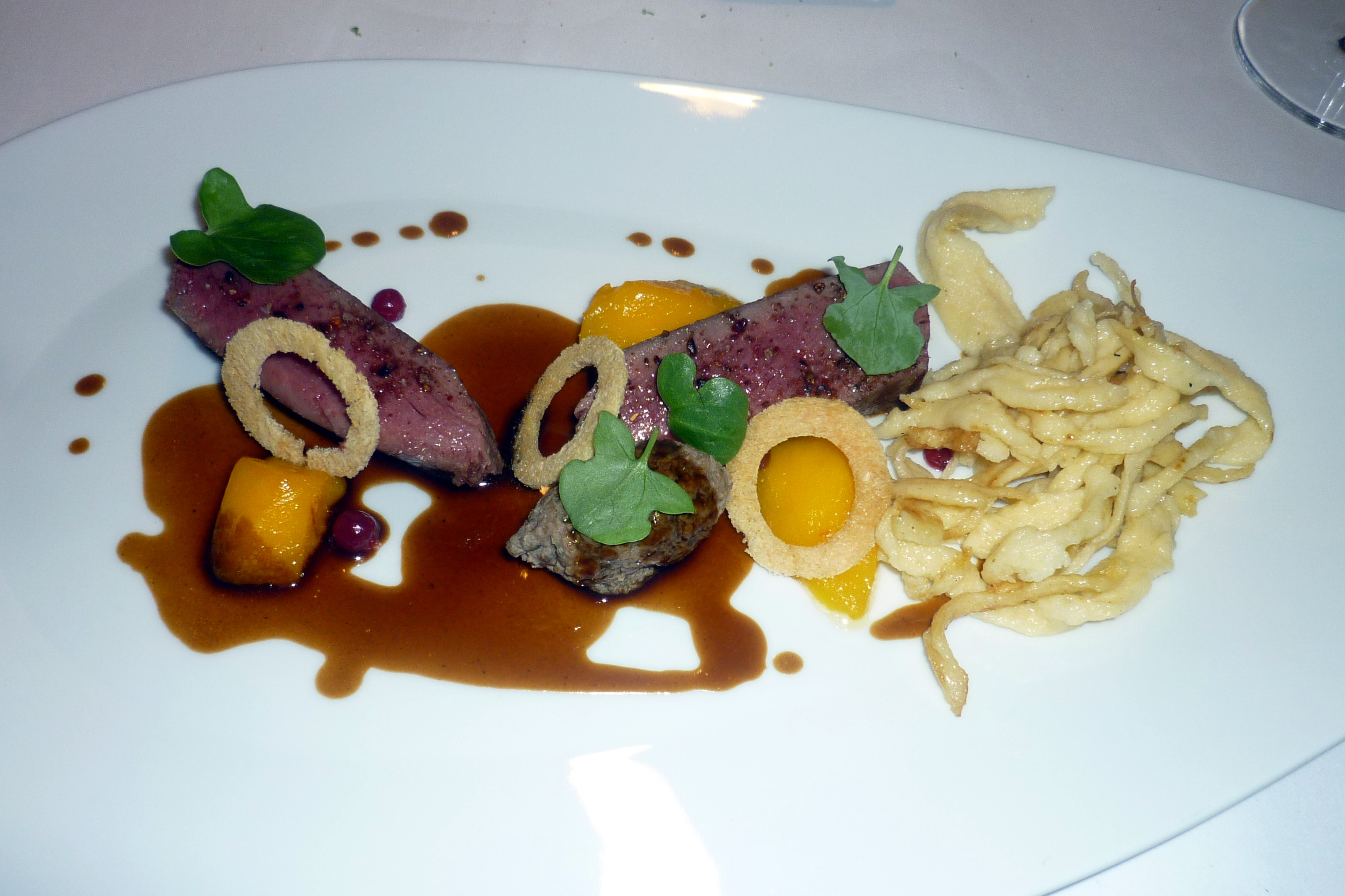 Reichenbacher Rehfilet mit Leberknödel, Mango und Schildampfer. Die Süße der Mango passte ausgezeichnet zum feinen Wildgeschmack, das Fleisch optimal gegart