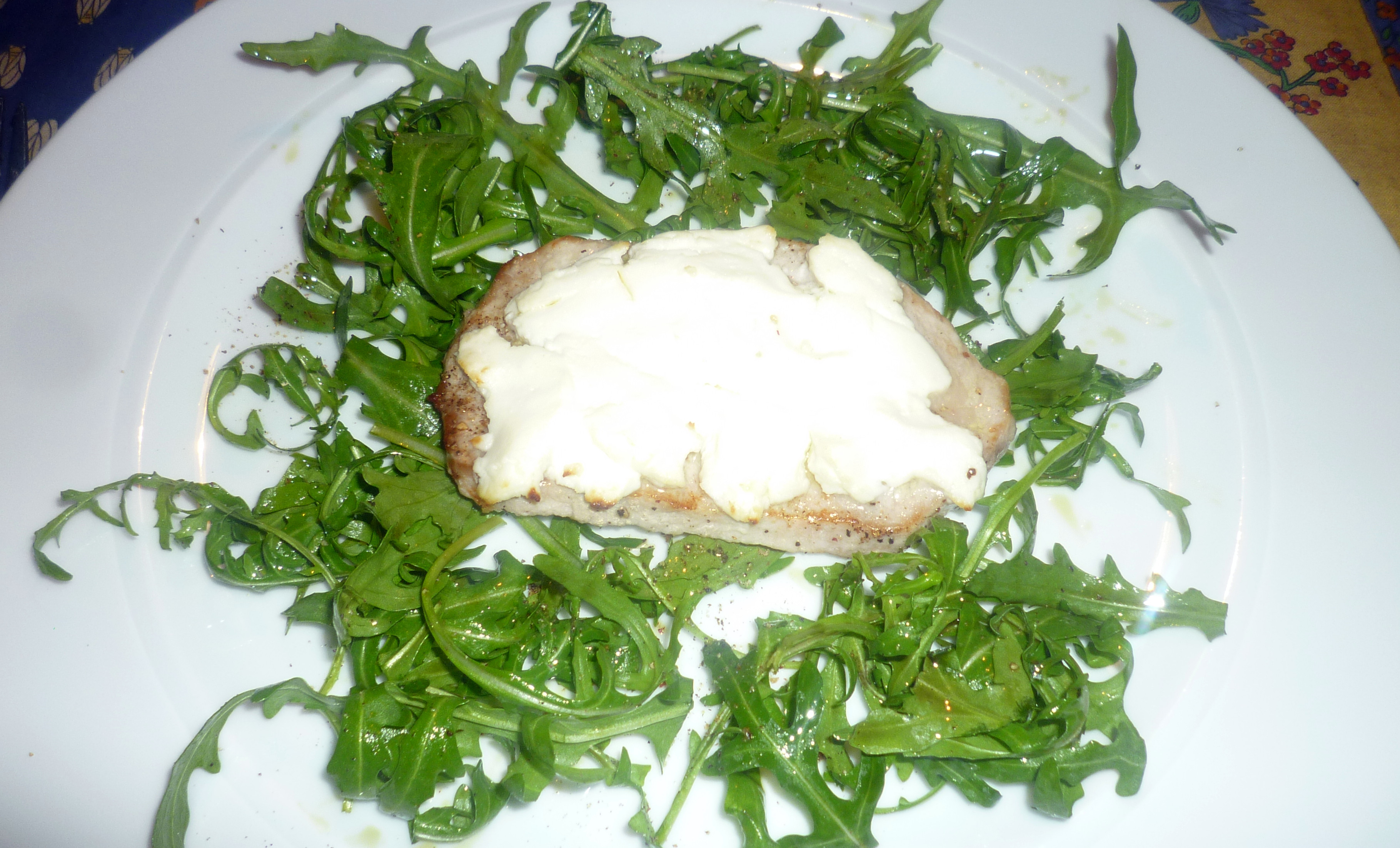 Schweinerückensteak mit Ziegenkäse gratiniert, dazu Rucola Salat.